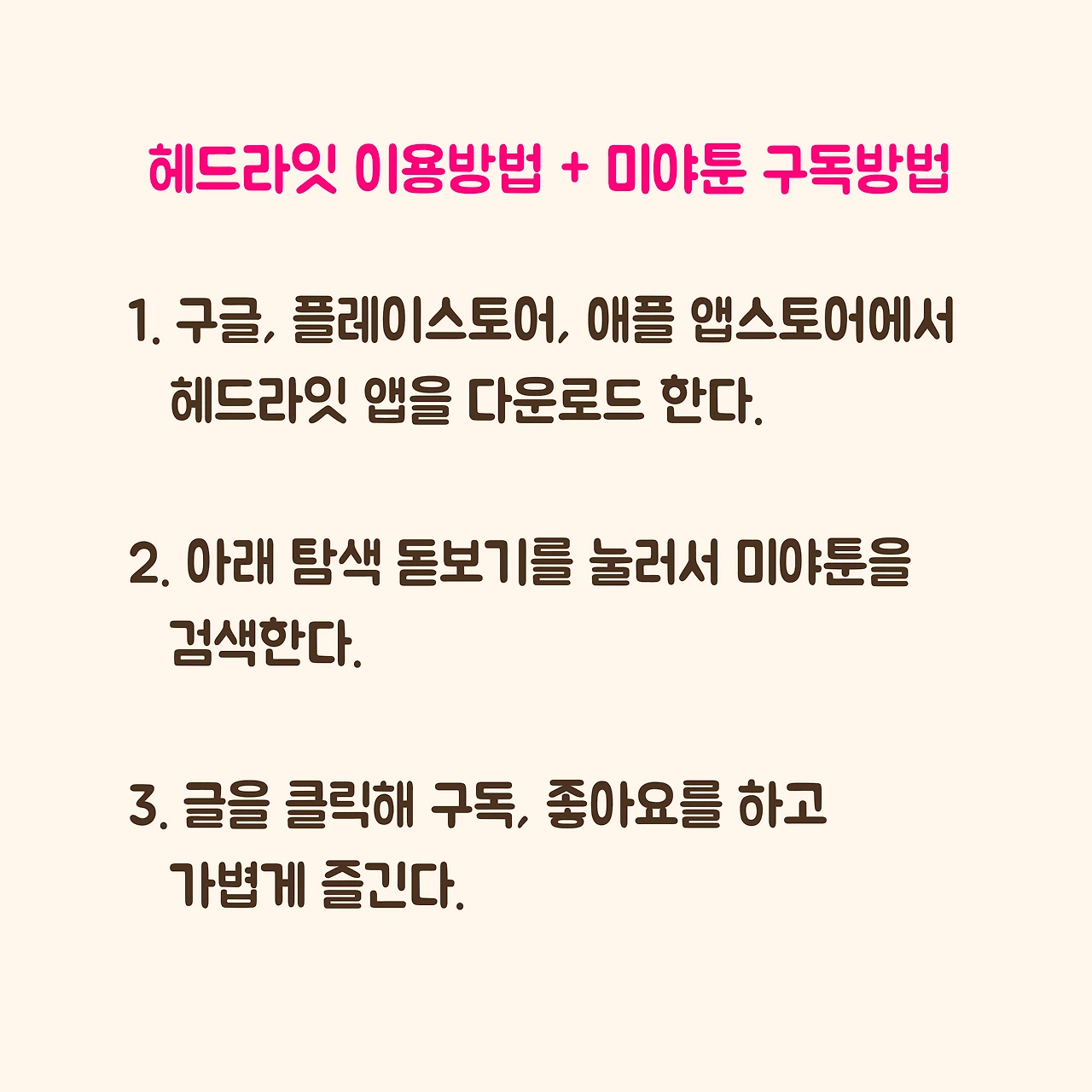 헤드라잇을 어디서 받는지 모르시는 분들은 아래 링크로 앱을 다운받으시면 됩니다. 미야툰을 읽어주시고 공감해주시는 구독자님들 모두 감사드립니다.