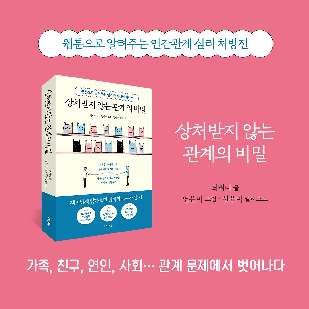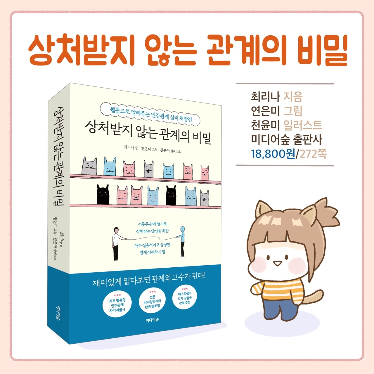 출판사 몇 곳에서 감사하게도 연락이 왔다. 그중 미디어숲 대표님이 우리 책의 특별함을 알아보셨다. 세상에 없던 자기 계발서. 웹툰으로 재미있게 다가가는 새로운 형식을 마음에 들어 하셔서 고심 끝에 미디어숲과 계약을 했다. 그렇게... 본격적인 글과 그림 작업에 들어가 수없는 회의를 반복하며 수정과 삭제와 재작업을 하고 글 퇴고를 반복하면서 1년 만에 세상에 나온 책,