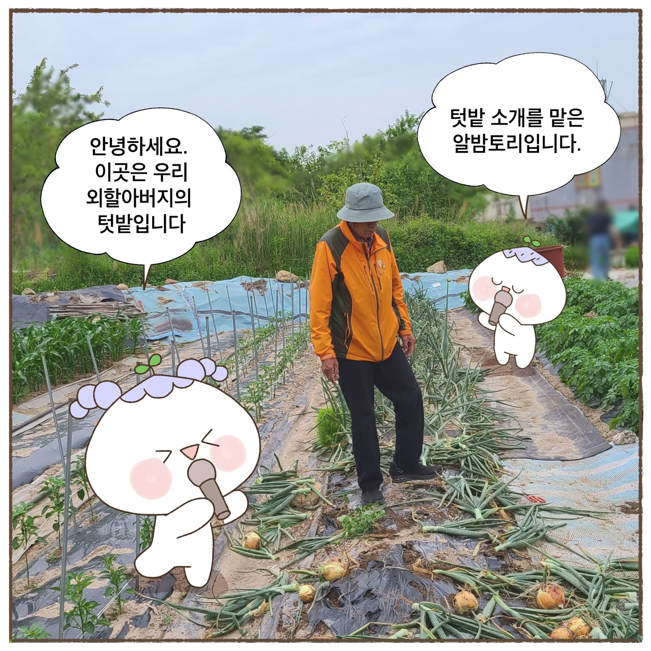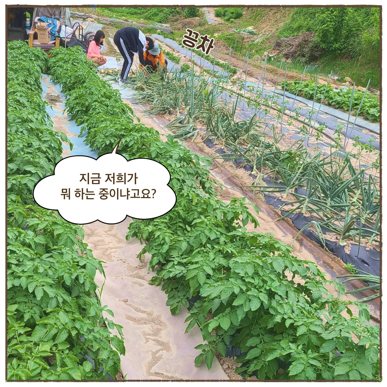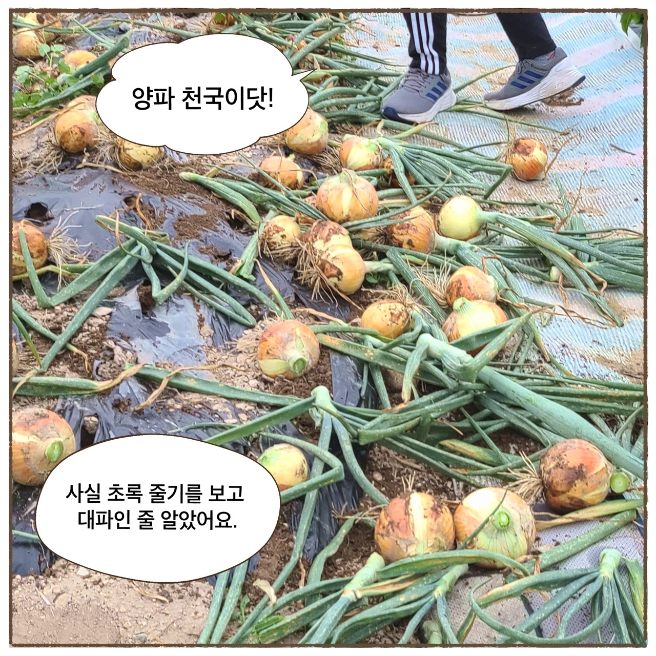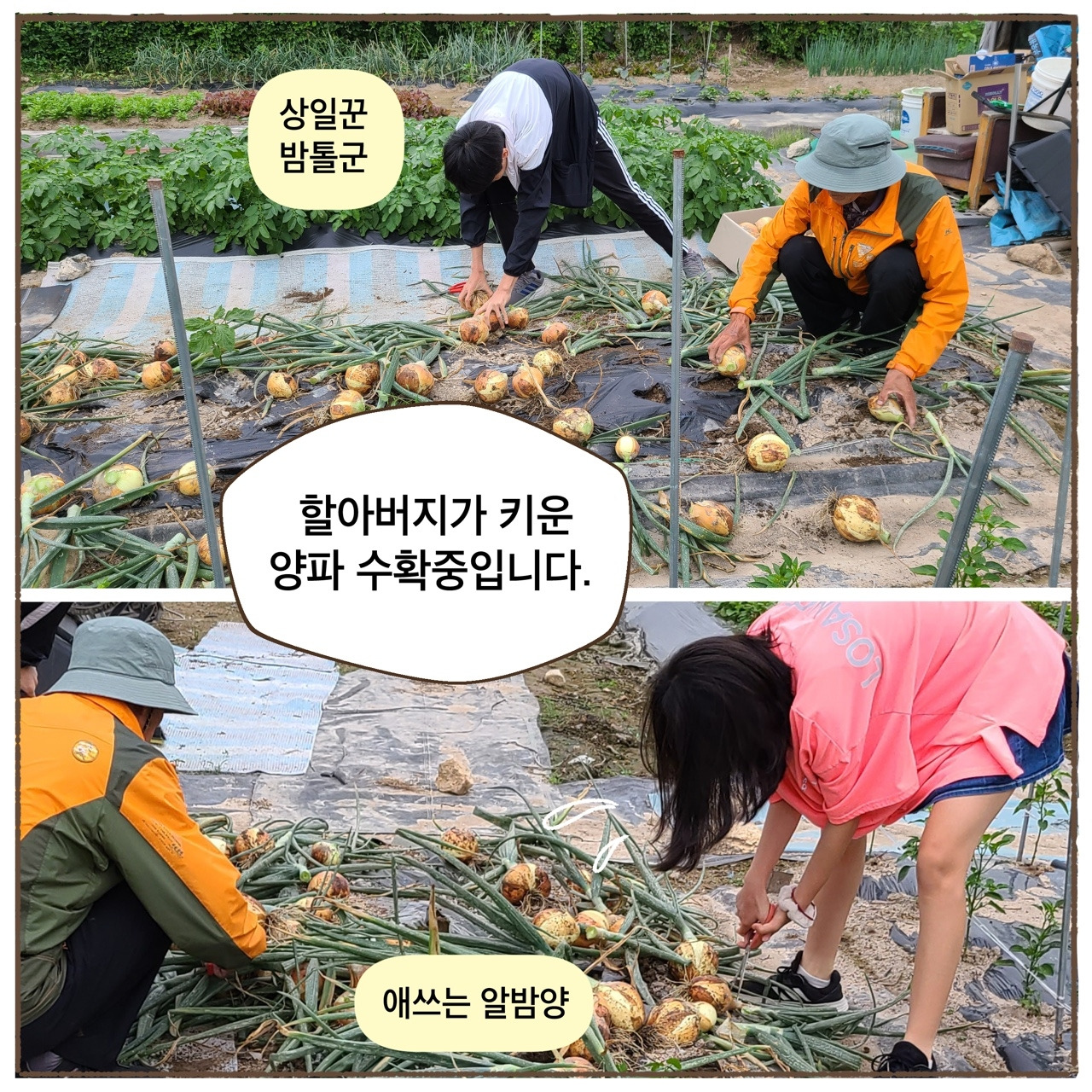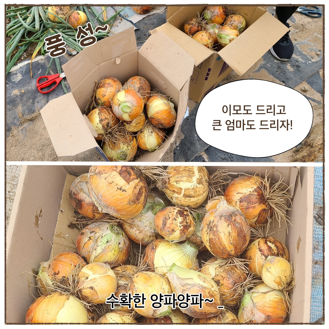 울산에 사시는 팔순 아빠는 종종 직접 가꾸신 농작물을 보내주신다. 양파, 고구마, 감자, 참깨 등 재철에 거둔 농작물을 받으면 너무 감사하다. 사실 양파를 박스채 보내주시면 양이 많아 빨리 먹을 수도 없고 오래되니 상하고 곰팡이가 펴서 많이 버리기도 했다. 이번에 직접 울산에 내려가서 아빠와 경주 여행을 하고 부산 시댁에 가는 길에 텃밭에 들렀다. 양파 줄기는 꼭 대파와 비슷하게 생겼다. 아이들과 함께 뽑은 양파는 아기 얼굴만 한 크기다. 아빠는 한 개라도 더 담아 주려고 하고 나는 너무 무겁다고 그중 몇 개를 빼려고 했다. 그렇게 꽤나 많은 양파는 차 뒷트렁크에 묵직하게 실려 부산 시댁에 드리고 언니, 엄마와 나눴다. 나누고 나니 생각만큼 양이 많지 남지 않았다. 아빠가 준다고 할 때 더 받아올걸. 밭에서 몇 개 뺀 양파가 조금 아쉬웠다.