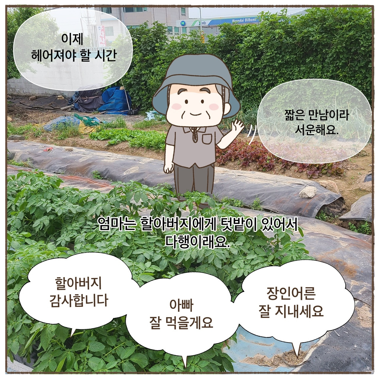 박스에 담긴 양파를 보니 아빠 손길이 떠오른다. 이번에는 잘 관리해서 버리지 않고 먹어야겠다. 나는 베란다에 신문을 길게 깔고 양파를 펼쳤다. 보기에 깨끗해보이진 않았지만 참고 한 달 정도 가까이 놔두니 껍질이 바삭바삭 말랐다. 마른 양파를 몇 봉지로 나눠서 냉장고에 넣었다. 한동안 양파 걱정 없이 아끼지 않고 팍팍 넣어 먹었다. 그런데 이번에는 양파를 잘 말려서 그런지 마지막 한 개까지 하나도 썩지 않았다. 그 전에도 말려서 넣었는데 무슨 차이가 있을까 생각해 봤더니 예전에는 며칠 말리고 성급히 냉장고에 넣었던 것 같다. 수분이 없도록 바삭 말리는 게 중요하다는 것을 이제야 깨닫다니. 아빠한테 양파를 넉 달 동안 하나도 안 썩히고 다 먹었다고 했더니 좋아하셨다. 나는 직거래 농산물을 좋아하는데 그중 아빠가 보내주시는 농산물이 제일 좋다.