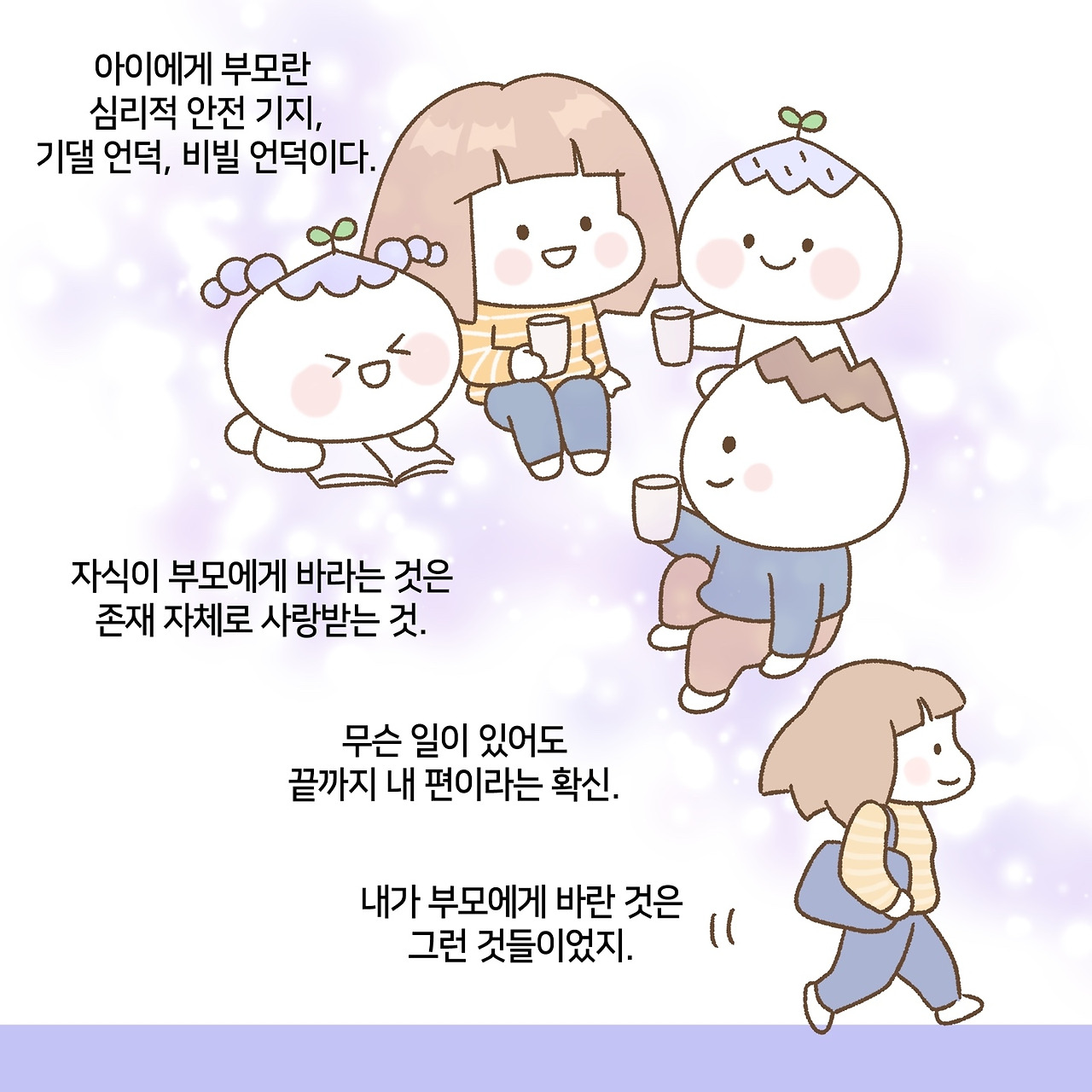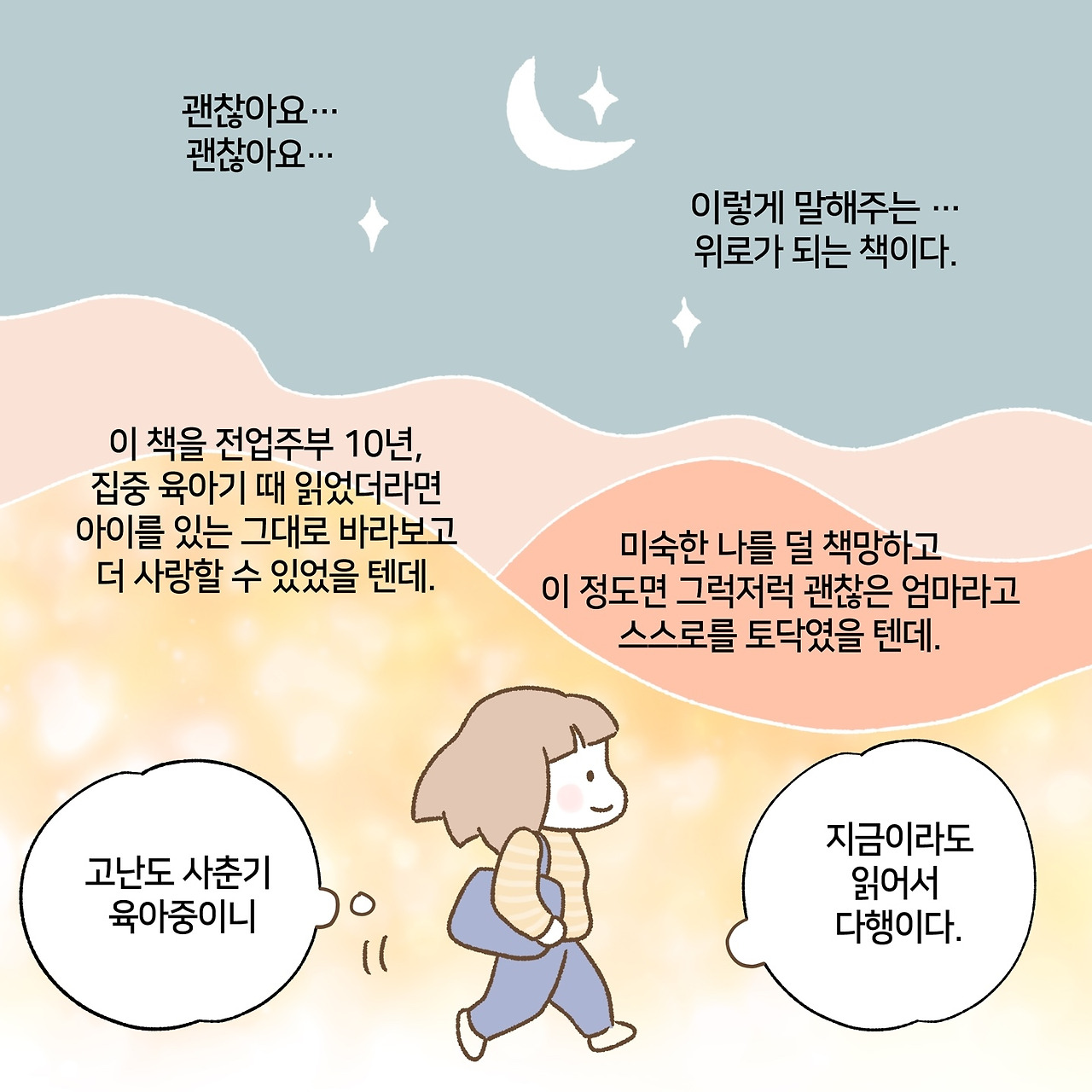 이 책을 아이들 어릴 때 읽었더라면 (그 때 나오지 않았으니 읽지도 못했겠지만) 잘 키우고 싶어서 애쓰는 선생님 포지션이 아니라 비빌 언덕이 되어주는 엄마 포지션으로 욕심을 내려놓고 있는 그대로 아이를 바라보고 사랑할 수 있었을 텐데. 미숙한 나를 덜 책망하고 그럭저럭 괜찮은 엄마, 그 정도면 잘했다고 나 자신을 토닥였을 텐데.