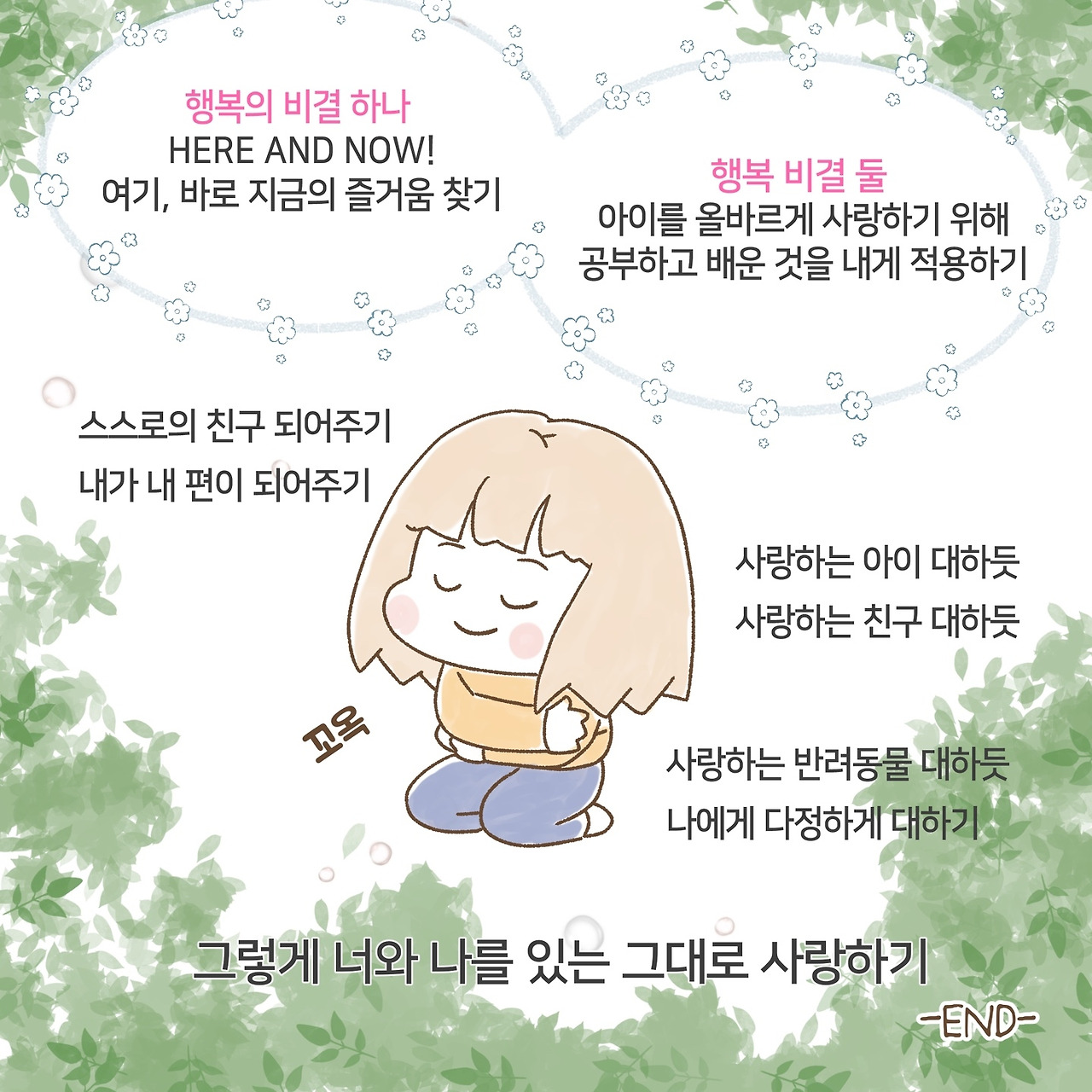 저자는 아이를 잘 키우고 싶어서 공부하고 애썼던 것을 내게 적용하란다. 스스로를 질책하고 비난하는 것을 그만하고 사랑하는 아이 대하듯, 사랑하는 친구 대하듯 스스로를 친구로 대해 주고 내 편이 되어주란다. 와, 맞다. 그렇게 하면 되는 거였다. 생각보다 쉬운 거였다. 아이는 그렇게 잘 키우고 싶어 하면서 그걸 나한테 해 줄 생각을 왜 못 했을까. 나 자신을 아끼고 사랑할 줄 알아야 타인을 사랑하는 마음도 점점 커진다. 내 마음이 가시밭길인데, 토양이 영양가 없고 팍팍한데 어떻게 건강한 식물이 자랄까. 먼저 나를 돌보자. 부족한 나를 인정하고 안아주고 사랑해주자. 나에게 관대해지자. 그 관대함이 아이에게, 남편에게, 타인에게 그대로 전해진다.
