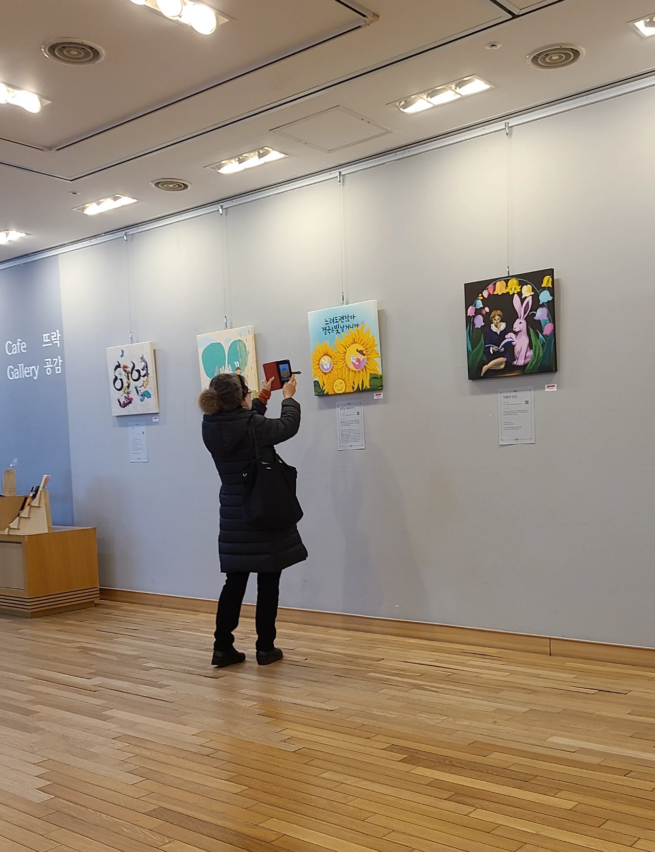 전시회 입구 세팅을 하고 오늘 짝꿍인 리선 작가님과 이야기꽃을 피우는 중이었다. 시니어 여성 한 분이 그림 앞에 머물러 있었다. 작품 하나하나를 가만가만 보시더니 사진도 찍으신다. 전시회 경험이 많은 리선 작가님은 관람객이 혼자 그림을 감상할 여유를 충분히 주고 적절한 타이밍에 옆으로 가서 친절히 작품 설명을 곁들였다.