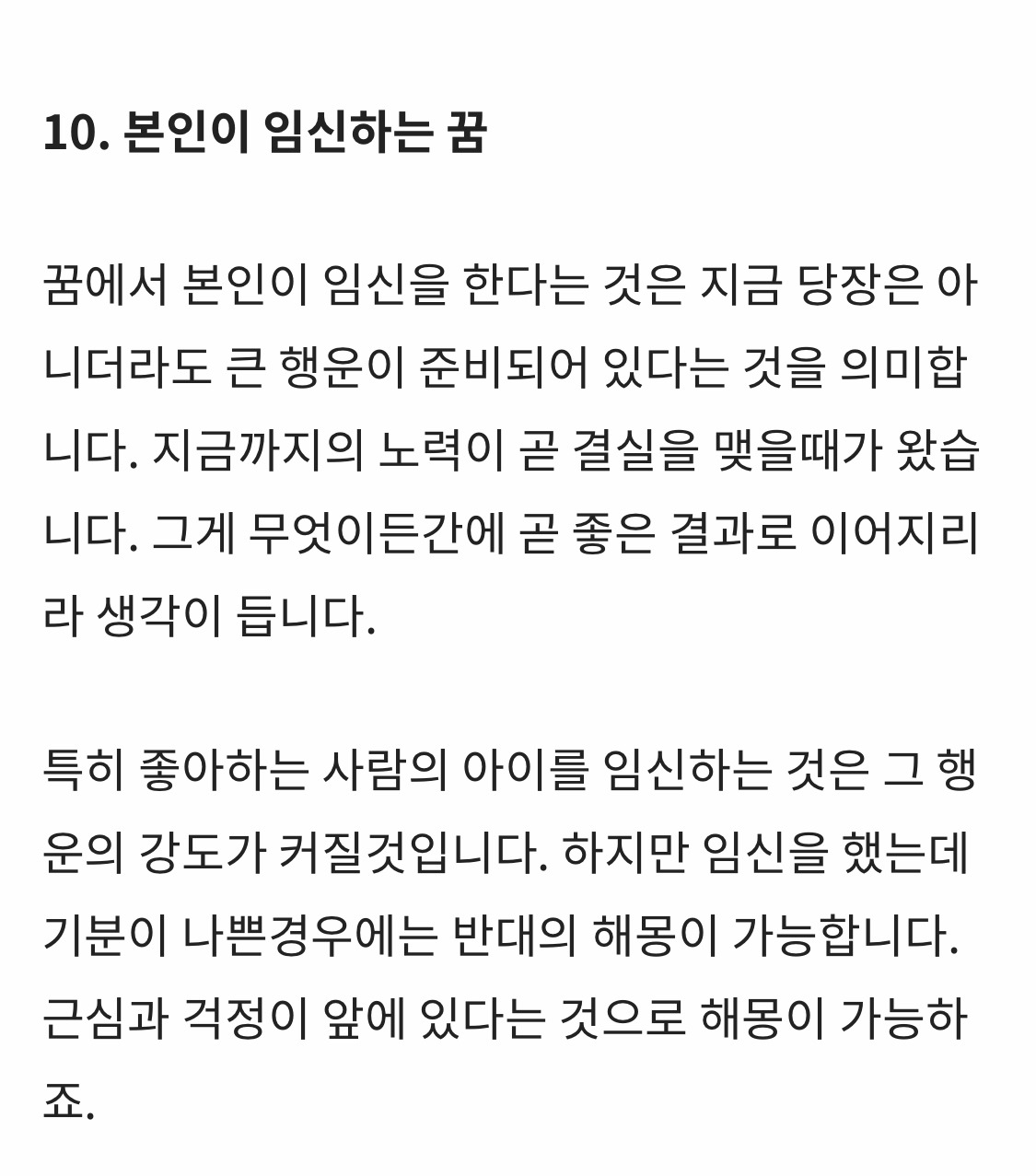 꿈에서마저 임신하는 꿈을 꾸다니... 해몽을 찾아보았다. 본인이 임신하는 꿈은 다른 사람에게서 임신 소식이 들려오거나 좋은 일들이 생길 꿈이란다. 대체 나 말고 누가 임신을 했나 궁금해졌다. 내 주변에 임신한 사람이 없는데? 아직 결혼 안 한 친구도 많고? 결혼식 하는 친구는 좀 있고.. 내가 혹시나 또 상처받을까 봐 임신했는데 말을 안 하고 있을 수도 있지...라는 생각도 얼핏 들었다. 내가 스트레스를 많이 받아하는 걸 아는 내 지인들은 출산하고 나서 혹은 출산을 얼마 안 앞두고 임신 소식을 말한 경우도 있다. 배려해 주는 마음에 감사했다.