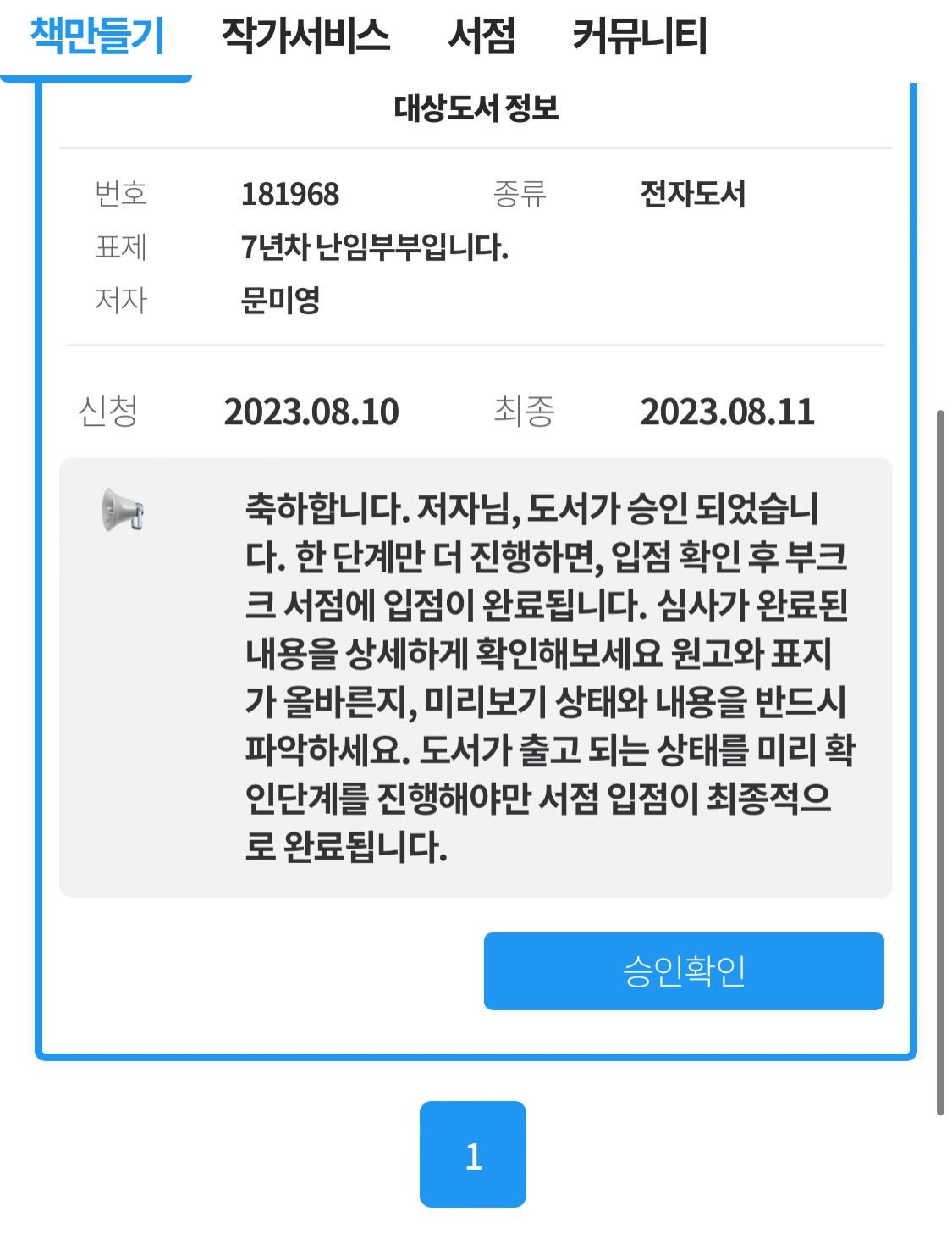 부크크에서 첫 전자책을 출간하였습니다. 표지에 작가이름을 안 쓰고 페이지 수가 적어서 반려되었는데요. 페이지를 늘리고 작가이름을 넣어서 최종승인 받았어요. 일반 서점에서는 구매 못하고 부크크에서만 구매 가능해요