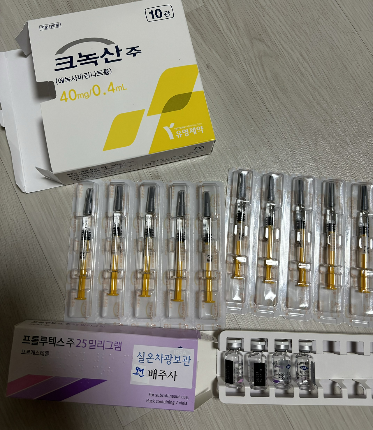 원장님이 2번의 유산 경험이 있는 내가 불안했는지 이번엔 멍주사로 유명한 크녹산 주사도 추가 처방해 주셨다. 아침엔 프롤루텍스, 저녁엔 크녹산. 내 배가 너무 불쌍하다.