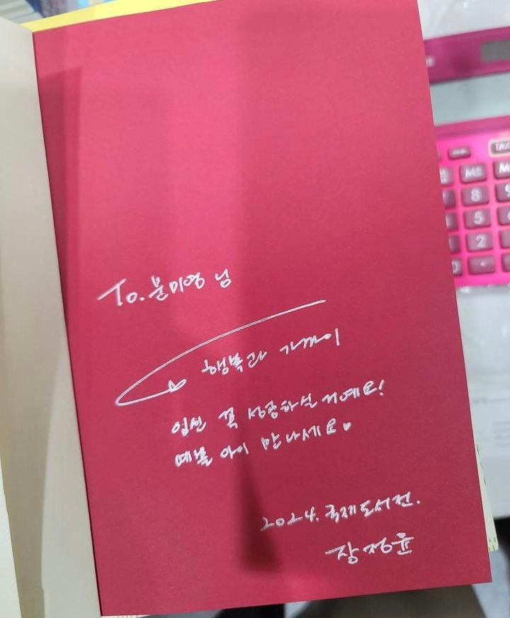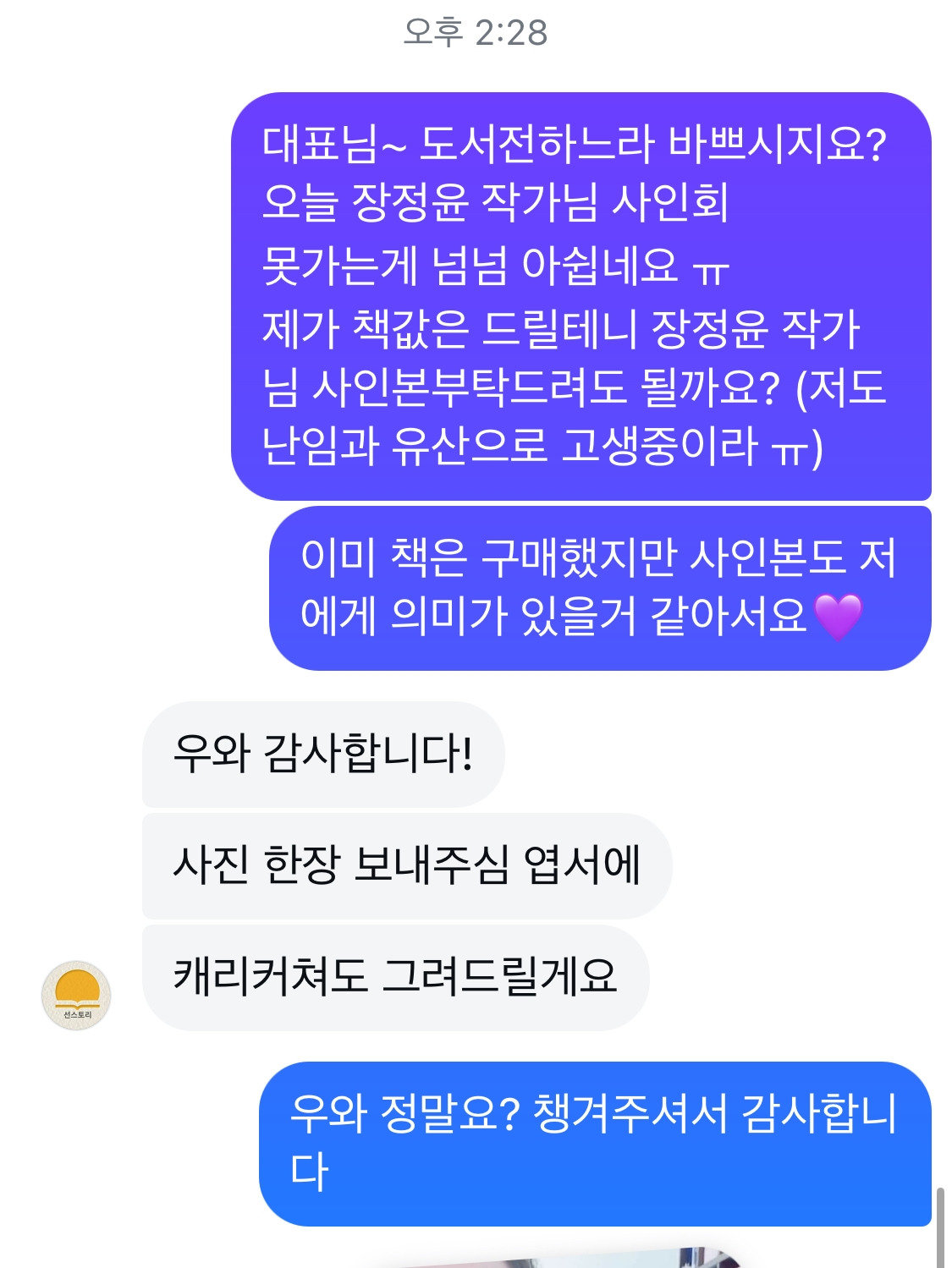 어제도 대표님이 국제도서전 관련 책 구매 사은품 배송 때문에 디엠을 먼저 주셨는데 혹시나 해서 부탁을 드려본다. 선뜻 사인과 캐리커처까지 받아주신다고 한다. 내가 책값을 보내는 거긴 하지만 감사하다. 바로 사진을 받아 돈을 입금해 드린다. 다음주가 기다려진다.