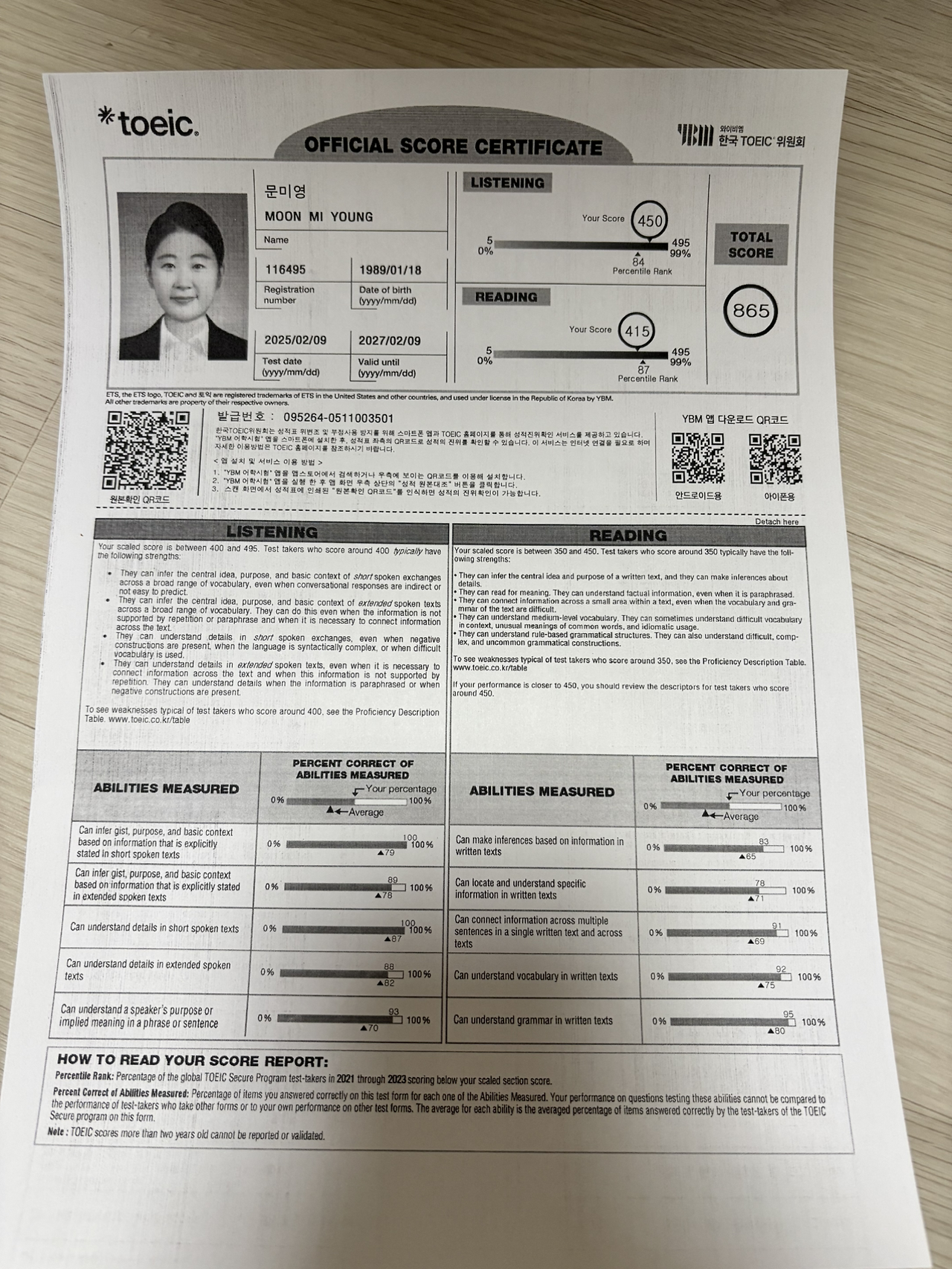 분명 시험 칠 때 시간도 남았고 1000문제 풀고 오답노트까지 만들고 답 맞춰봤을 때 감도 좋았다. 다른 응시자들에게도 쉬웠던 것일까. 점수 정체기가 있다고는 하지만 너무 실망스럽다. 아니 865점이 뭐야 ㅋㅋ900 가까이라도 가야지.