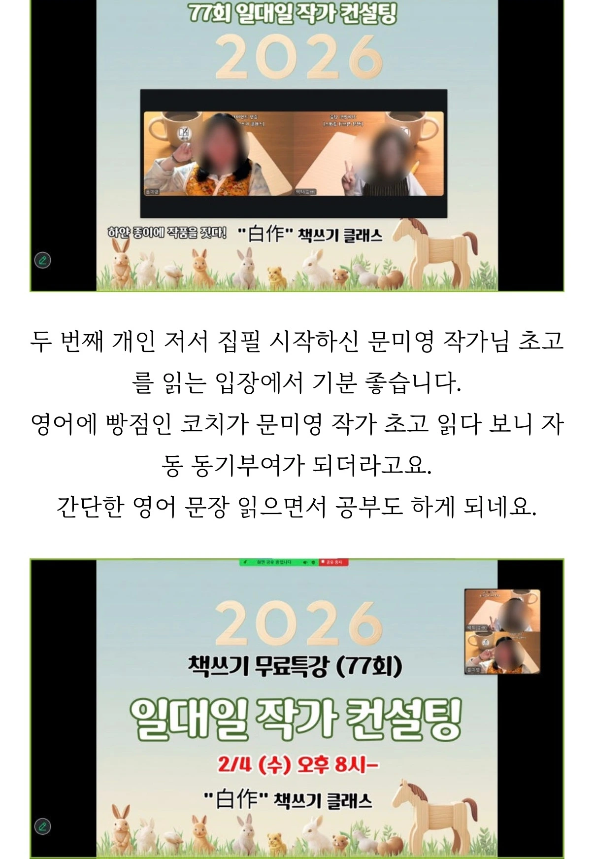 최근에는 사람들이 “글을 잘 읽히게 잘 쓰세요. 책 읽어봤는데 잘 읽히게 쓰셔서 좋았어요.”라는 칭찬을 해주시는 경우도 있다. 하지만 나는 아직 ‘난 왜 이렇게 글을 못 쓰는 걸까, 다른 작가들은 잘 쓰시는데.. 어떻게 몇 년을 매일 글 써도 제자리걸음이냐.’라며 자책한다.