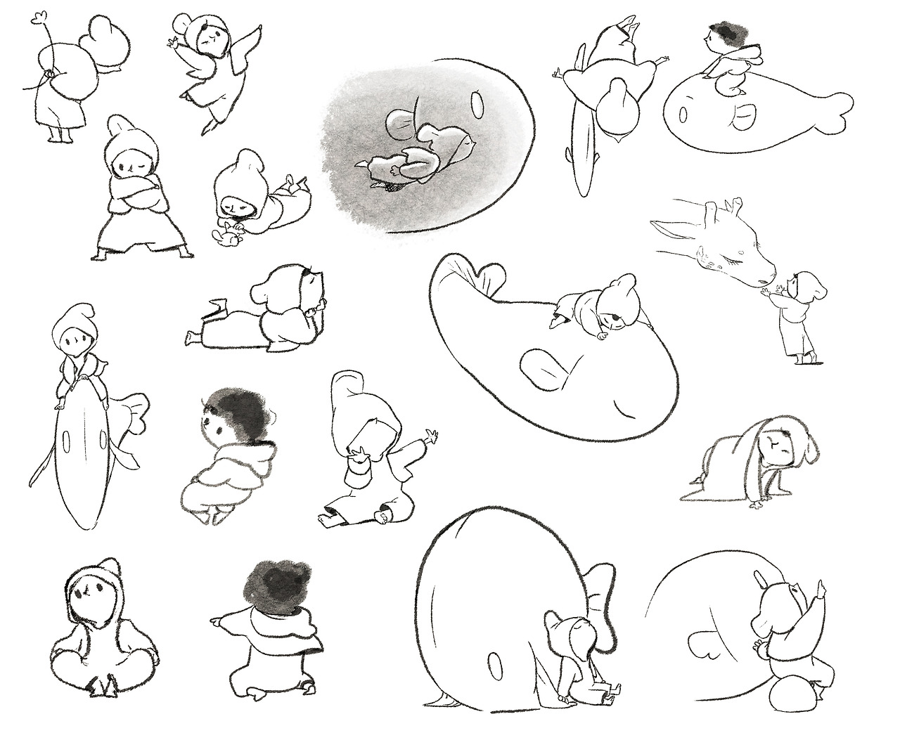정확하지는 않지만 6~7살 아이를 생각하며 캐릭터를 디자인했다. 성별은 상관없다. 아직 몸이 영글지 않아 하는 행동마다 서투름이 묻어나는 작은 아이. 그런 느낌이면 좋을 것 같다 생각했다.