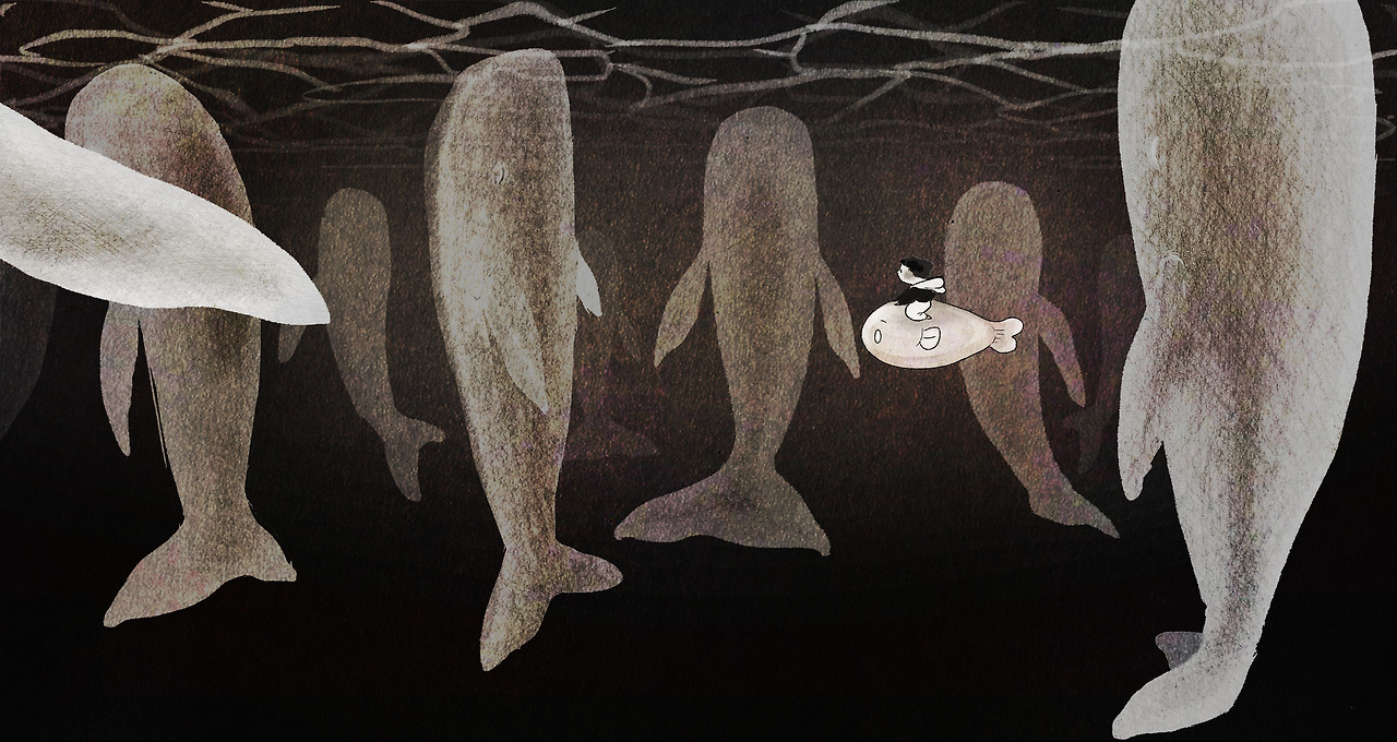 이 모습에서 아이디어를 가져와, 고래가 잠을 자는 수면 아래의 공간을 하나의 배경으로 만들었다. 이야기에 처음 등장하는 파트로, 아이가 상상할 수 있는 가장 먼 곳-. 상상 속 먼바다를 묘사하는 공간이기도 하다. 처음 구상했던 아트워크에는 고래와 물고기의 비율차가 크지 않게 그려졌지만, 후에 작업된 애니메이션에서는 극단적인 크기 차를 두어 넓고 깊은 공간을 표현하는데 집중했다.