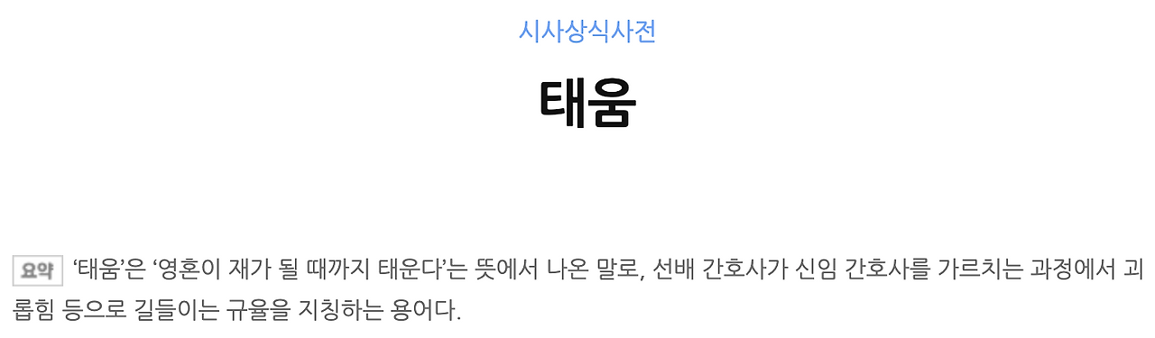 그렇다. 내가 신규간호사 일 때는 태움이 일상이었다. 지나간 일에 크게 후회하지 않는 편인데, 살면서 후회되는 일 중 하나가 부당한 태움을 그냥 버텨내기만 했다는 것이다. 네이버에 태움이라는 단어를 검색해 보면 이런 무시무시한 뜻으로 해석되었다.