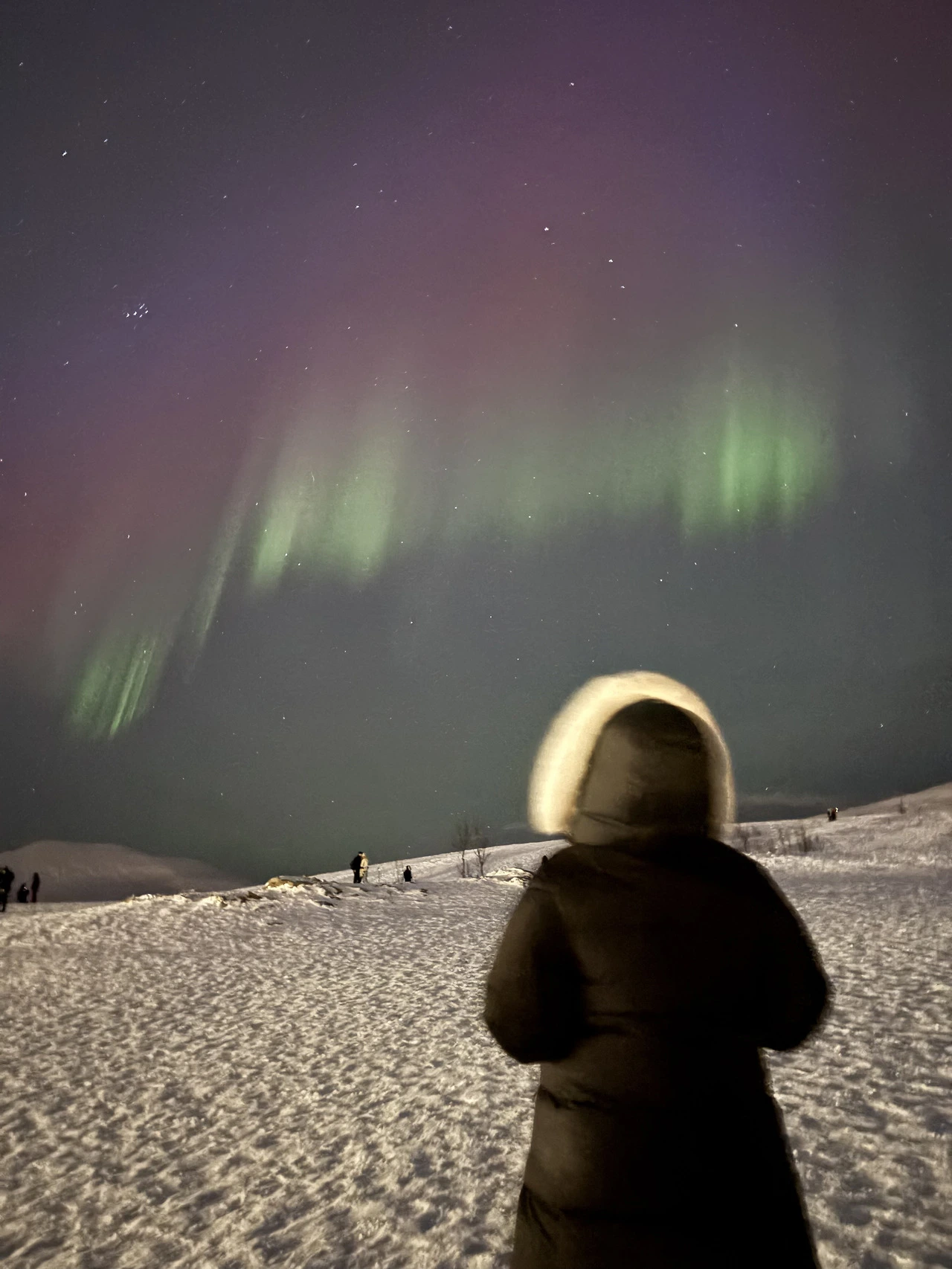 걸을 수록 힘듦은 익숙해져갔으며 사람들과 대화하면서 서로의 사는 얘기, 자연이 주는 아름다움을 같이 감탄했었다. 힘들지만 그 시간이 없다면 보지 못한 순간이었다. 해가 뜨지 않는 극야이지만 해가 뜬 시간임을 알 수 있는 환함을 있었고 끝없이 펼쳐진 눈이 만들어진 눈밭은 빛을 받아 반짝반짝 빛이 났다. 배경은 하얀 눈 속에서 짧은 시간의 낮 이기에 한쪽은 동틀 무렵의 색인 핑크색, 파란색, 보라색이 보이고 다른 쪽은 해질 무렵의 색인 노란색, 빨간색이 보였다. 같은 장소, 시간대에서 볼 수 있는 아름다운 색조합이었다. 처음 이 활동을 하기 전에 들었던 생각을 단번에 잊을 정도였다. 멋진 걸 보기 위해서는 그 만큼의 인내의 시간이 반드시 필요하다.