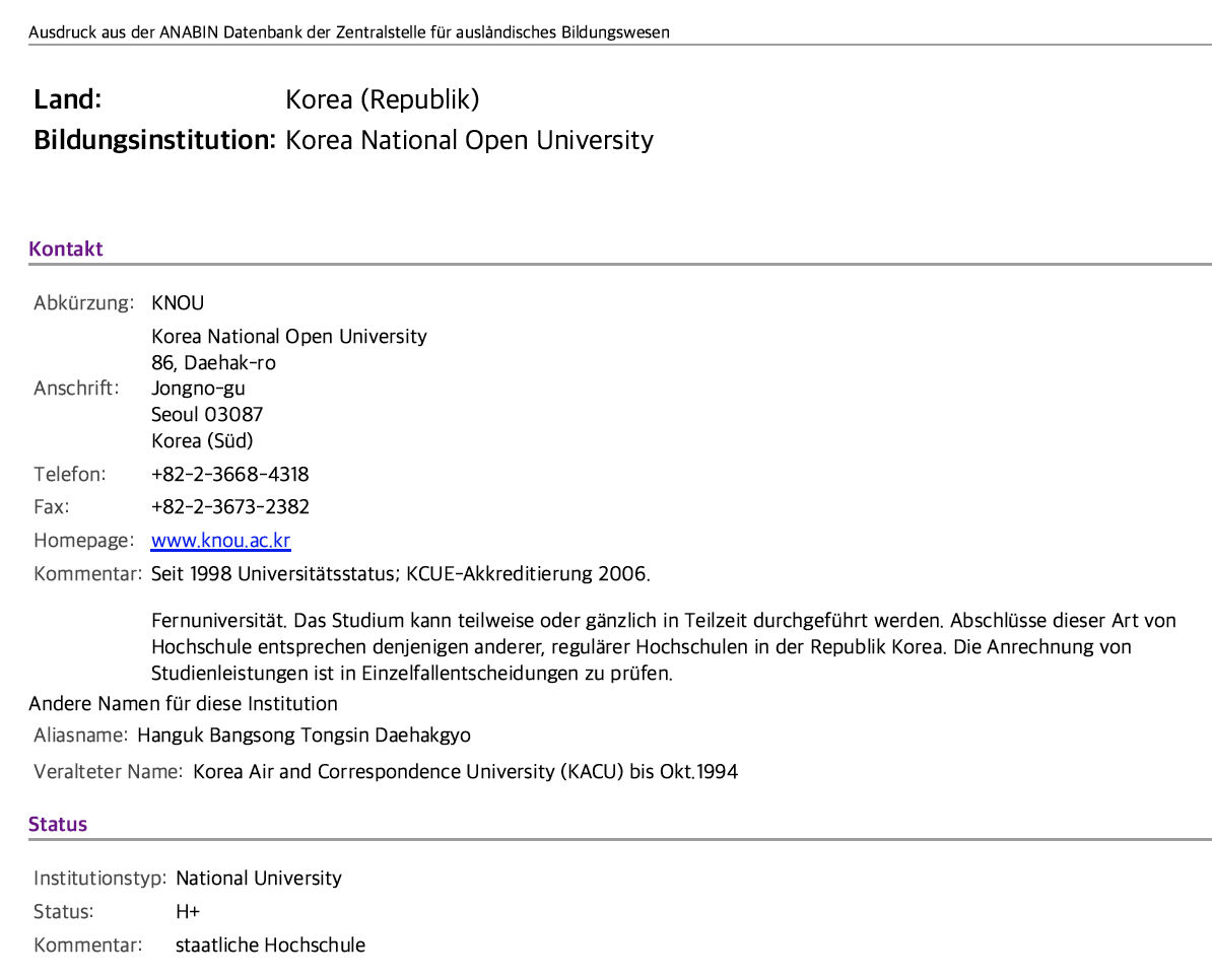 독일에서 인정되는 4년제 종합대학(H+)으로 방송통신대가 등록되어 있기 때문에 전문대학(H-)으로 표시되는 다른 사이버대학보다 낫다는 생각이 들었다.