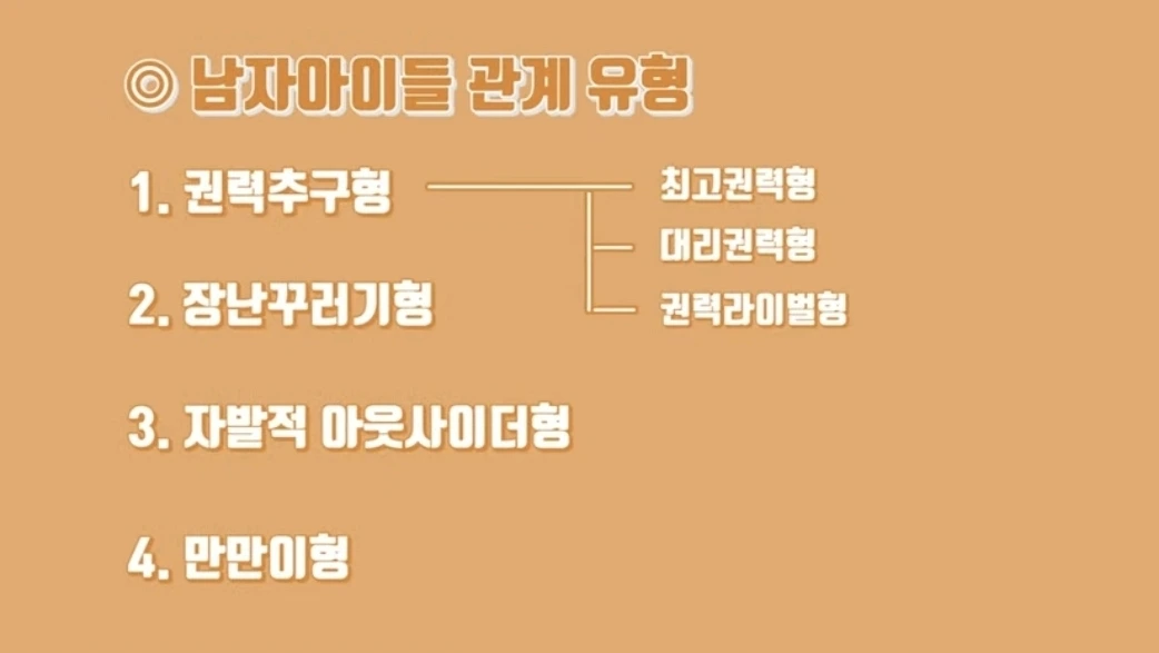 최고권력형 : 리더, 대체로 인기가 많다. 영향력이 있고, 의사 결정권자, 운동신경 좋고. 이아이를 중심으로 무리가 형성된다
