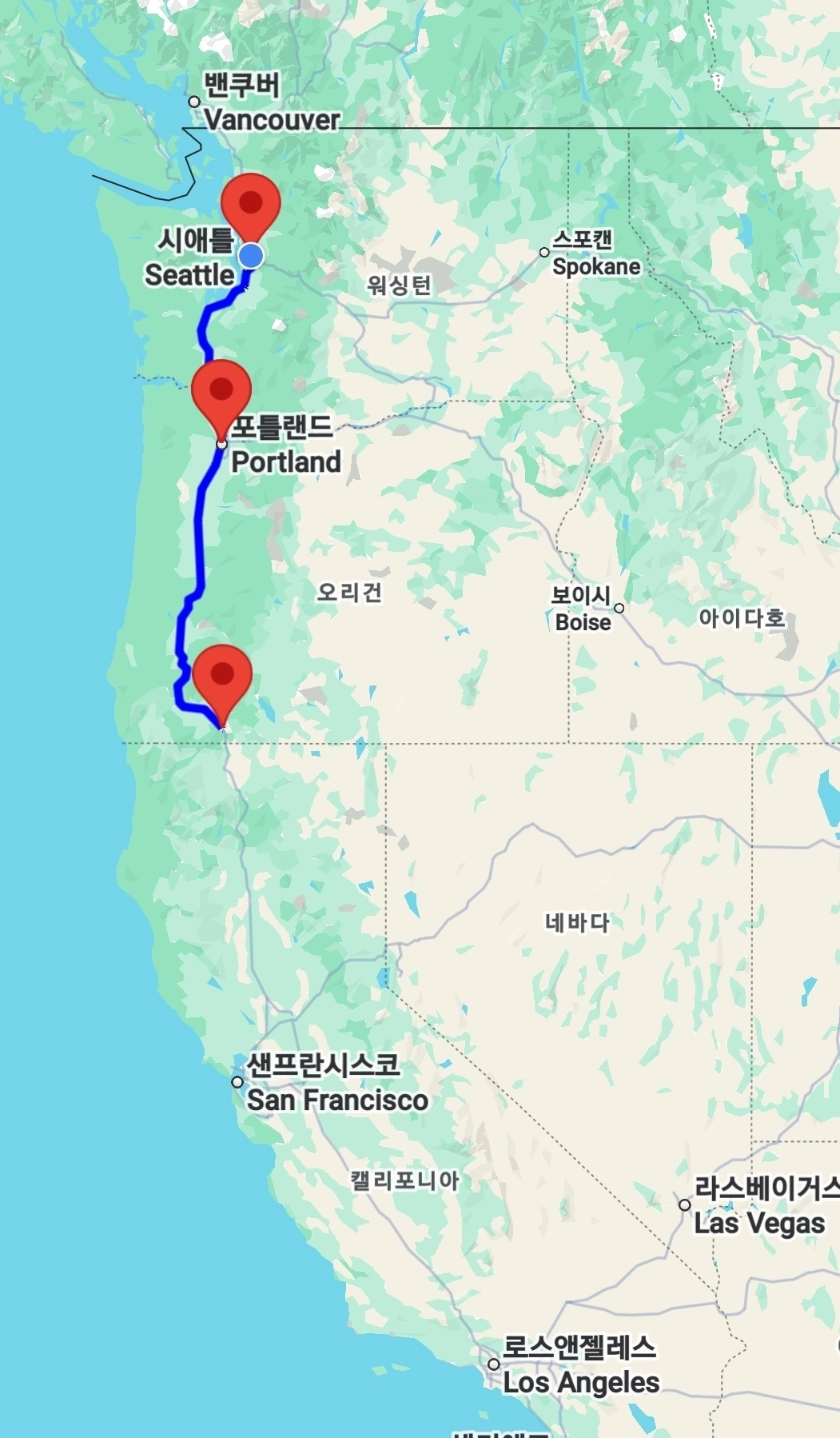 * I-5 하이웨이는 보통 여기서는 아이파이브라고 한다. 미국 서부해안선을 길게 잇는 주요 고속도로이다. 캘리포니아주에서 시작하여 오리건주와 워싱턴주를 지나 캐나다 국경까지 이어지는데, 벨뷰에서 캐나다 여행을 갈 때에도 I-5 North를 타고 3시간 정도 가다 보면 미국과 캐나다 국경선이 나온다. 서부의 주요 도시인 로스앤젤레스, 샌프란시스코, 포틀랜드, 시애틀을 연결한다. 우리는 로드트립 내내 I-5 South를 따라 하염없이 내려간다.
