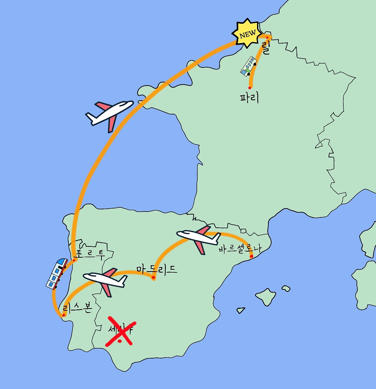 이제 마지막 남은 교통편은 포르투갈의 도시 포르투에서 프랑스 파리로의 이동이었다. 항공권 가격이 어마어마했다. 그렇다면 일정을 우회해서 파리 근교로 가보자. 프랑스를 넘어 벨기에, 독일 도시까지 물색한 결과, 가장 파격적인 가격에 항공권을 구매할 수 있는 ‘릴’이라고 불리는 벨기에와 프랑스의 국경 쪽에 위치한 도시로 향하기로 했다. 이 도시를 발견했을 때는 신대륙을 발견한 콜럼버스처럼 유레카를 외쳤다. 항공권 가격을 90퍼센트 줄이다니, 이런 구원자는 또 없을 것이다.