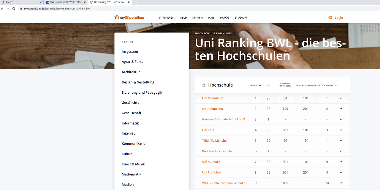 [한국이나 미국과 다르게 독일은 종합대 학보다 과가 유명한 전문대학교(University)가 훨씬 높은 평가를 받는다. 랭킹에 찾아보면 나와있는 전문대학은 한 분야에서 크게 각광받지 못함 (LMU제외, 잘 사는 뮌헨 지역에 있어서 그런지 전반적으로 평타 이상인듯한 뮌헨대학). 랭킹을 찾을 때 과별로 랭킹을 봐야 한다. 랭킹은 모든 종합적인 부분에서 평가를 하기에 매년 엎치락뒤치락 다를 수 있다. 예를 들어 경영학과에서 랭킹을 찾는다면 Uni ranking BWL을 검색해봐야 한다. (경영=Betriebswirtschaftslehre, 짧게 BWL)]