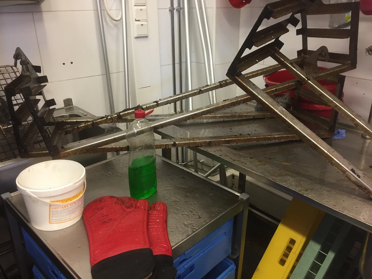 고개까지 돌려가며 약품을 뿌리고 나선 철수세미 같은 것으로 기름때를 긁어낸다. 내가 세상에서 가장 싫어하는 소리를 2시간 동안 참아야 한다. 은박지가 바사삭 거리는 소리도 싫어하는 내 귀에 철과 철의 만남이라니! 한 번 때를 긁어내고 나서 뜨거운 물을 뿌려준다. 그리고 또 약품을 뿌리고 때를 벗기다 보면 철의 본래 모습이 보인다. 오븐 안도 똑같이 수세미로 닦아줘야 한다. 오븐 안은 약품을 뿌리지 않고 뜨거운 물로만 닦는다. 뜨거운 물을 붓고 열심히 닦고 물과 기름 찌꺼기를 내보내고... 또 닦고. 육체노동은 반복 또 반복이다.