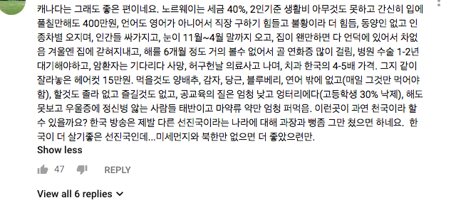 그중 단언 압권은 분노에 차서 써 내려간 것 같은 위의 댓글이었다. 눈이 11월에서 4월 말까지 오고, 거지같이 잘라 놓은 헤어컷이 15만 원, 연어 밖에 없고 매일 그것만 먹어야 함, 할 것 '졸X' 없는 나라. 노르웨이에 대한 평은 혹독했다.