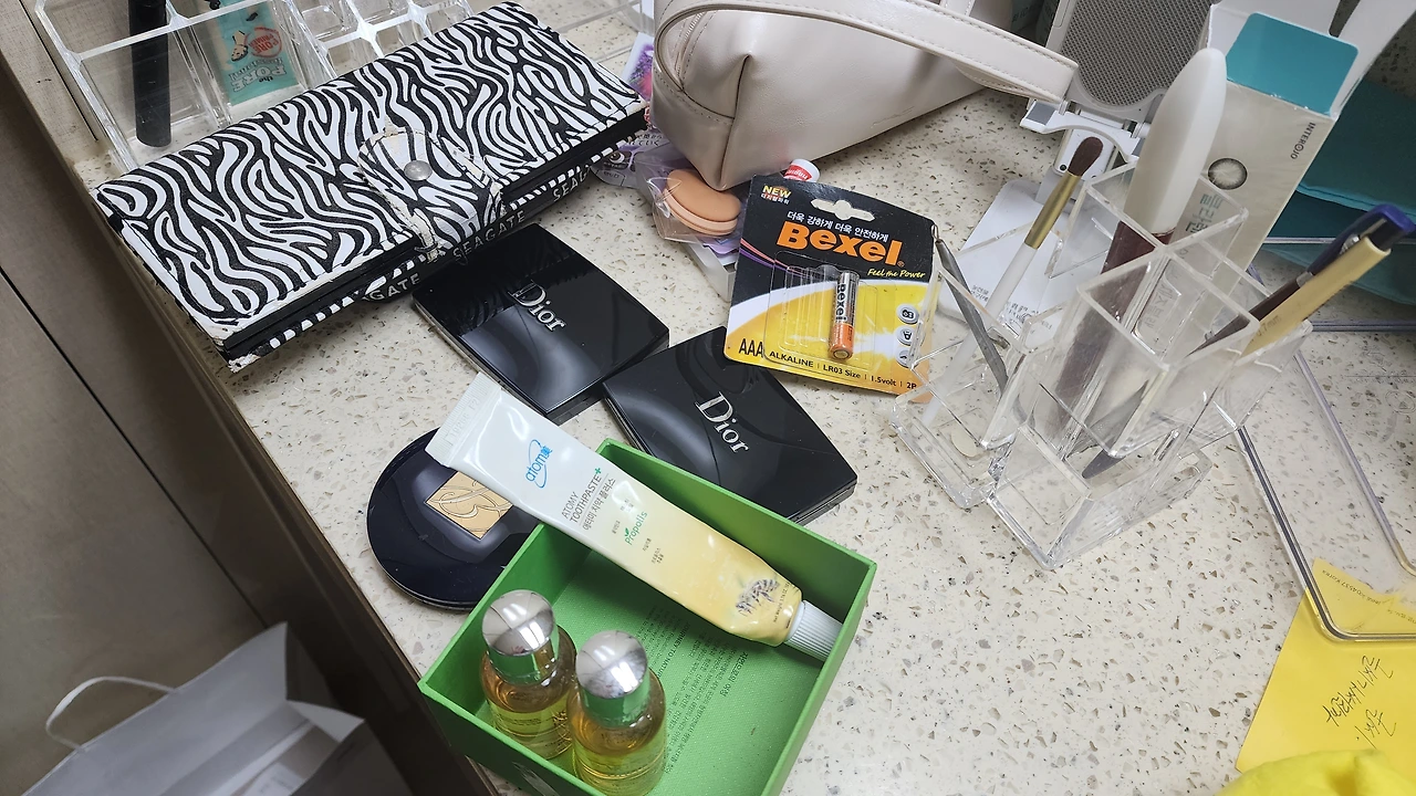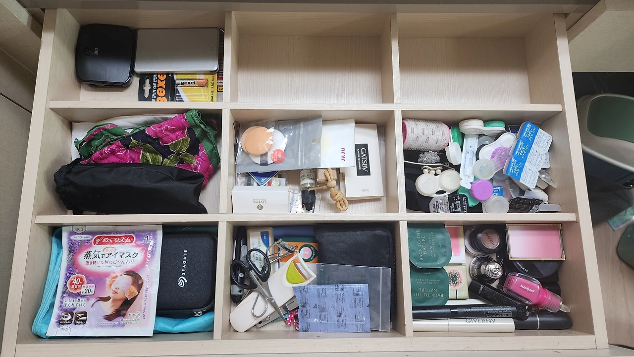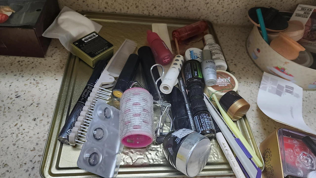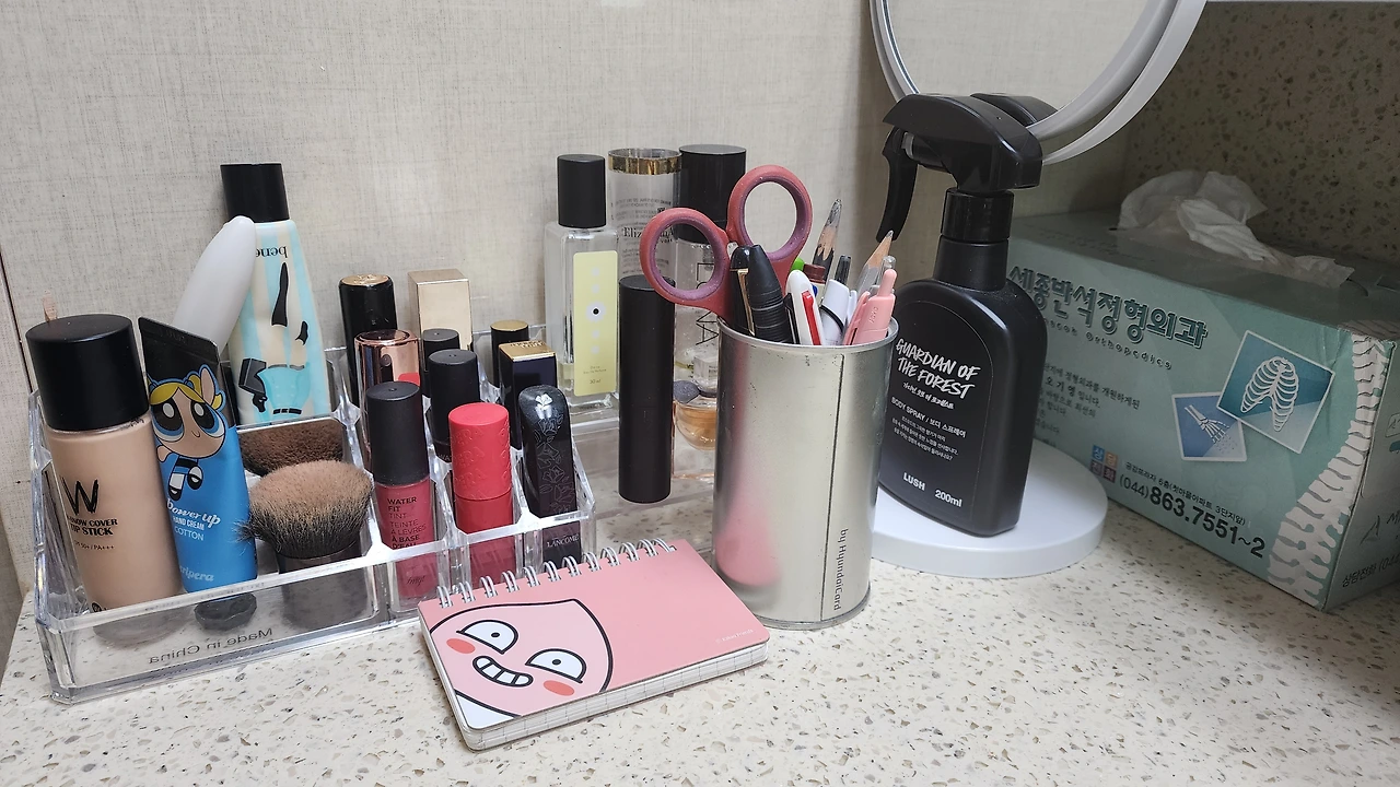 어제 정리하다 만 화장대 위는 환장의 콜라보다. 있는 물건을 모두 쓸어 담아 봉지에 넣어 내려놨다. 화장대 위엔 주로 매일 쓰는 화장품, 메이크업 화장품 외에도 액세서리, 동전, 통장, 확대거울, 펜통, 메이크업 브러시통들이 올려져 있다. 그런데 살다 보면 가장 많은 물건이 길을 잃고 헤매는 곳이 화장대와 부엌 싱그대 위인 것 같다. (치워야지 하는 생각이 들긴 하지만 오늘은 일단 내가 필요한 물건의 개수를 세는 일이 우선이다.)