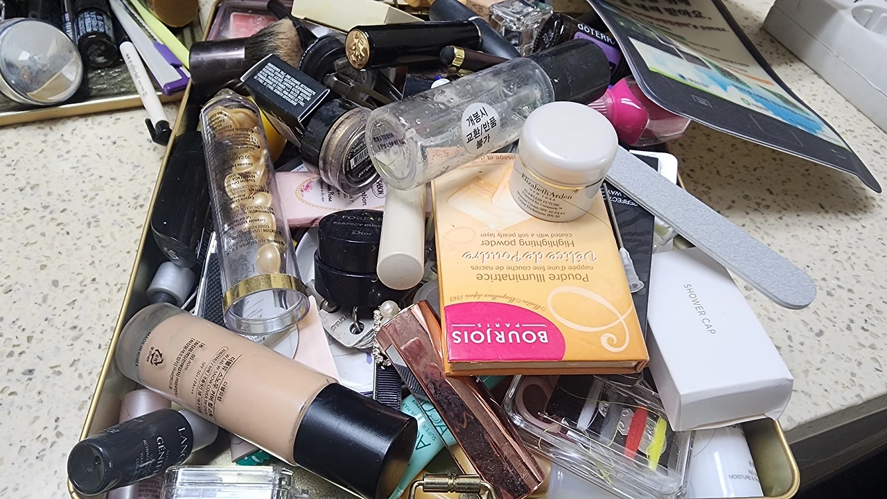 사실 간단하게 한 제품씩만 있으면 화장대가 이렇게 복잡해질 이유가 없으련만 홈쇼핑과 길거리 로드숍을 돌아다디거나 백화점에 가면 내 늙어가는 피부를 위해 뭔가 하나씩 사 온다. 어떨 때는 영양크림, 페이스오프 타입의 얼굴팩, 다른 기능이 들어가 있는 파운데이션이나 쿠션, 기분이 꿀꿀하다는 이유로 하나씩 사 모으거나 누군가 가볍게 선물해 주는 립스틱, 얼굴 노화를 방지해 준다는 오일, 좀 다른 기능이 있다는 메이크업베이스, 핸드크림, 잘 뿌리지 않는 향수, 바디로션, 바디왁스 등등 이런 제품들을 사서 모으다 보면 어느새 화장대는 꽉 차서 더 이상 무언가를 놓을 수 없는 지경에 이르고 만다. 그러면 화장대를 정리하겠다고 물건들을 거울 뒤 수납장에 차곡차곡 쌓놓으면 언제 이런 물건을 샀는지조차 잊어버리고 만다.