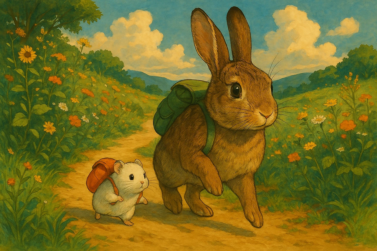 여를이와 콩이는 배낭을 하나씩 둘러메고 봄나들이에 나섰습니다..