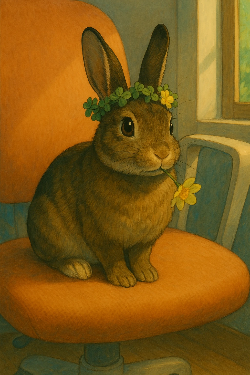 오렌지색 의자에 올라 여느 때처럼 편하게 몸을 식빵처럼 네모나게 말았어요.