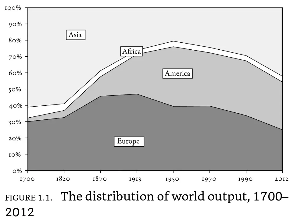 1900년에서 1980년까지 세계의 생산량 중 80%는 유럽 및 아메리카(미국, 캐나다)에 집중되어 있었다. 근현대의 과학, 정치, 경제, 예술 등이 서구 중심으로 돌아가게 된 근간에는 바로 세계경제를 지배했던 절대적인 "생산량"에 있었다. 예를 들어 영국과 미국은 최소한 1970년대까지는 빈부격차가 적고 주택시장은 안정화되었으며 노동소득이 높았던 이유도 바로 이러한 산업적 생산이 받쳐주고 있었기 때문이었다.