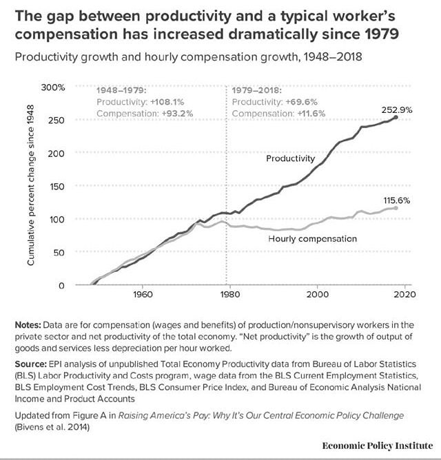 이 그래프가 현대 자본주의의 결과를 가장 잘 나타내고 있다고 생각한다. 신자유주의가 시작된 70년대 후반 이후로 늘어나는 산업생산(252.9%)만큼 근로자들의 경제적 보상(115.6%)은 따라오지 못하고 있다. 즉, 산업생산에서 발생하는 잉여가치가 제대로 근로자들에게 분배되지 못하고 있다.