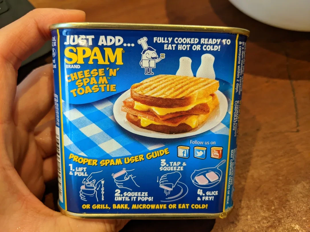 가끔 한국음식이 그리울 땐 밥반찬으로 스팸을 사다가 구워 먹는다. 근데 부엌에 있는 영국 스팸 캔에 적힌 레시피가 흥미롭다. 같은 스팸이지만 동서양의 레시피가 전혀 다르다. 동아시아인들은 찰진 쌀밥과 함께, 서양인들은 바삭하게 잘 구워진 빵에 올려 즐긴다.