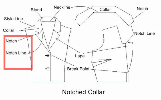노치란 V자형으로 새긴 금이나 벤 자리를 말한다. 즉 V자형으로 새긴 칼라를 말한다. 테일러드 칼라처럼 윗깃과 아래깃 사이에 V자형으로 잡힌 형태이다.