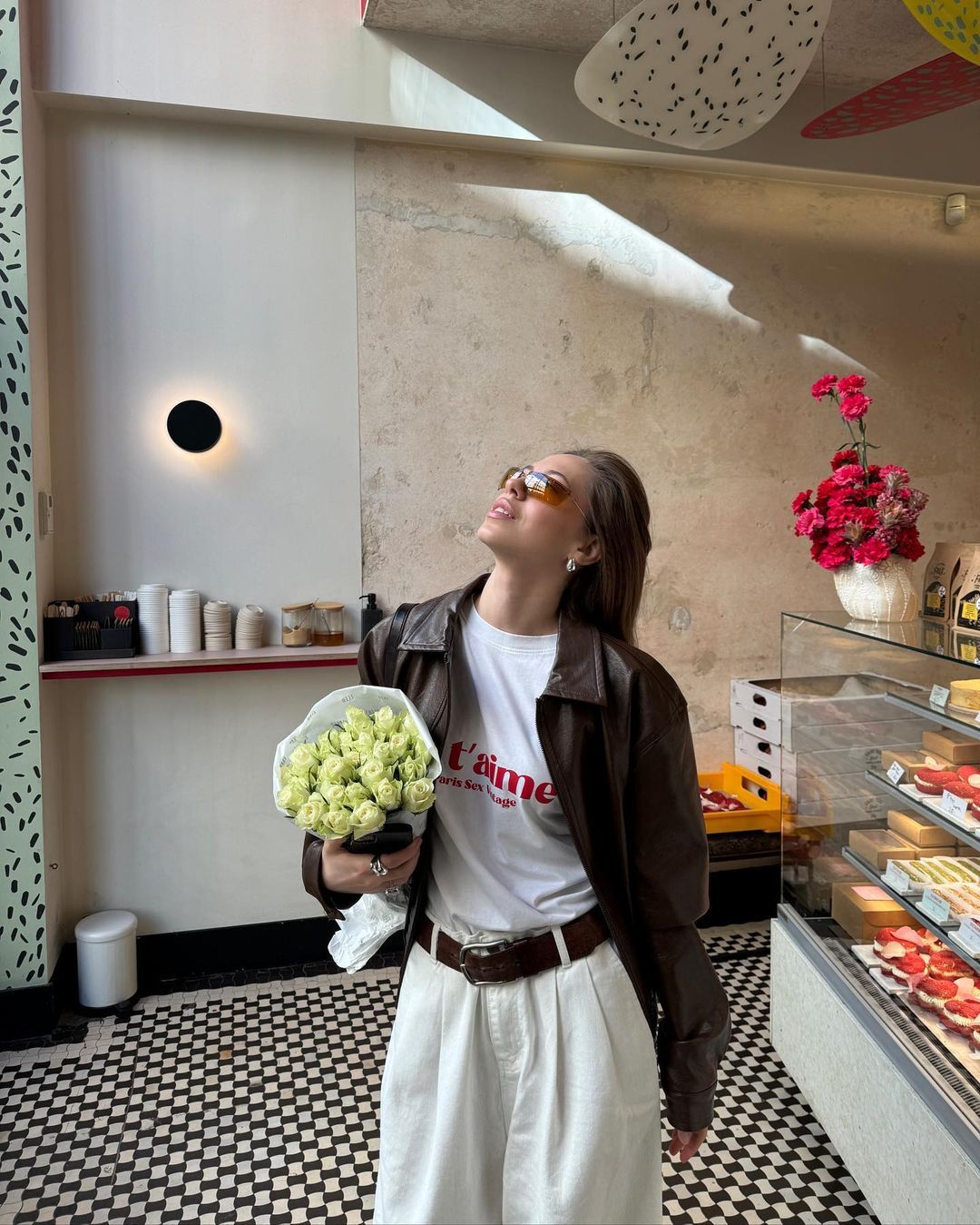 한 치수 큰 데님 팬츠에 M 사이즈 티셔츠를 넣어 입는 것이다.