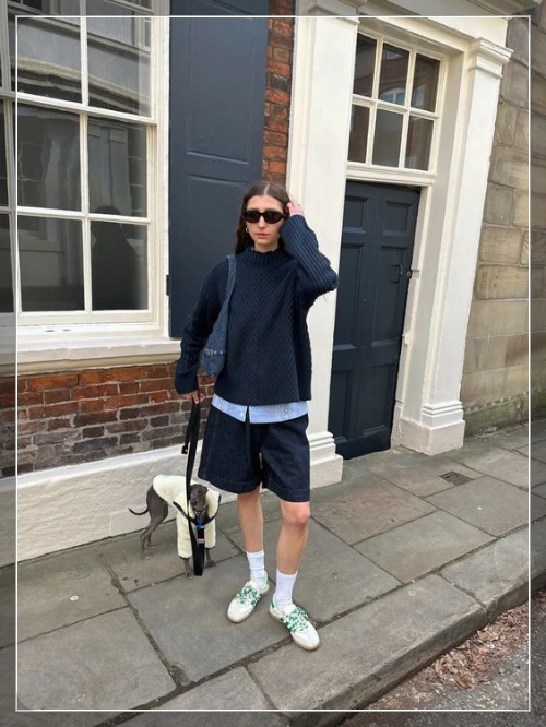 따라서 나는 버뮤다팬츠 같은 길이를 입을 때는 무조건 발목을 가리거나, 두툼해 보일 수 있는 연출의 도구를 넣는다.