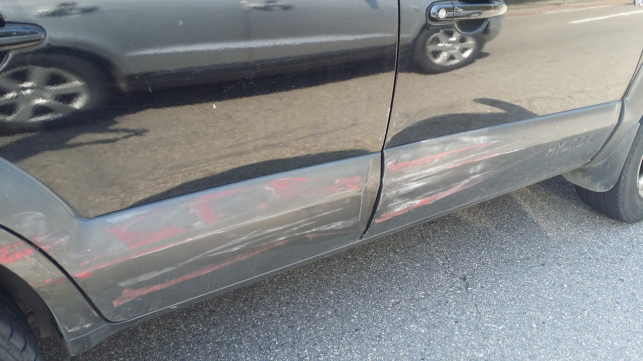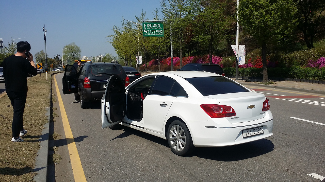 옆차가 내 차 오른쪽 앞뒤 문짝 전체를 박자, 내차는 마치 배 처럼 중앙선쪽으로 기우뚱 흔들리면서 핸들마저 왼쪽으로 돌아가려고 한다. 끝까지 양손으로 고정시키며 차선을 유지하고 브레이크를 밟았다.