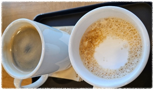 창 너머로 보이는 전경과 따뜻한 라떼 한 잔이,