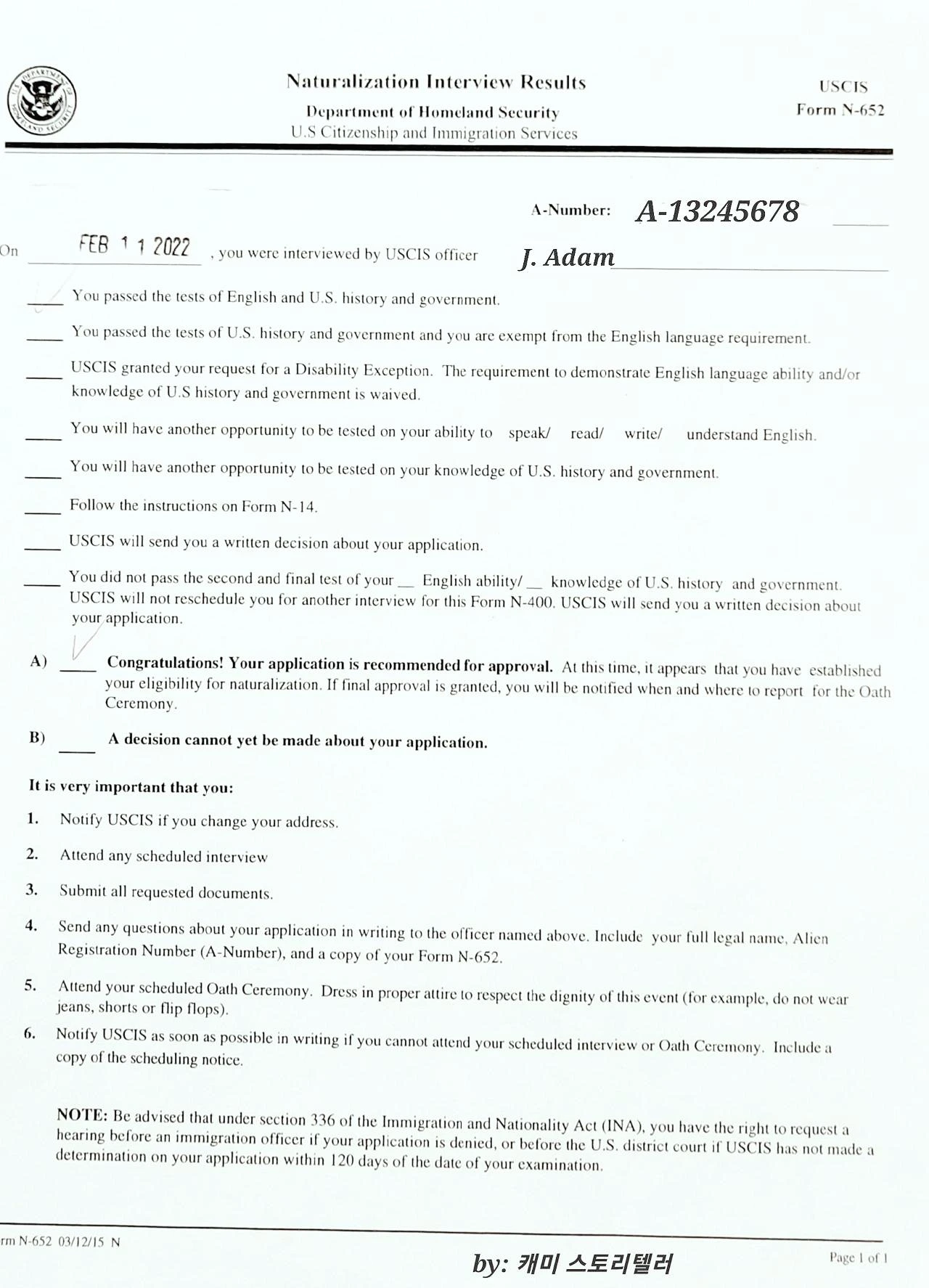시민권 인터뷰에서 심사관을 선택할 수 없으므로 인터뷰 가기 전 준비서류들을 완벽하게 준비하는 것만이 최선이다.