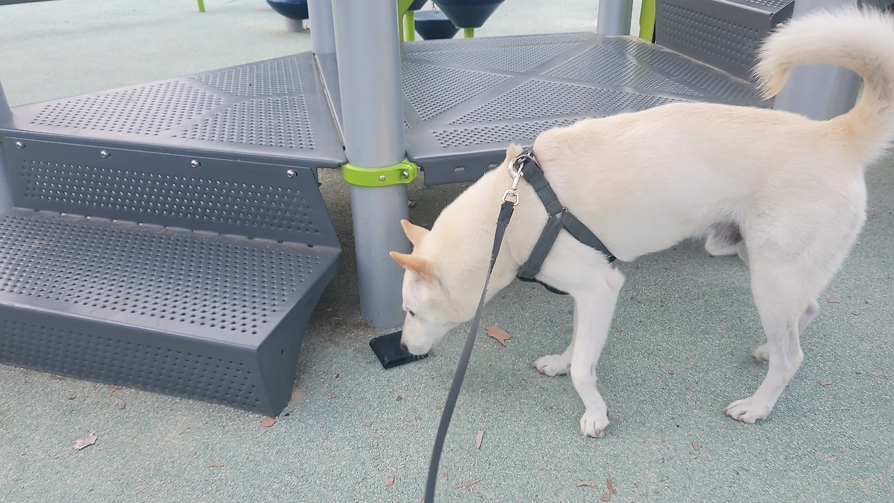 그날 아침에도 태극이에게 잠깐의 자유를 주기 위해 이른 시간이라 아무도 없는 놀이터에 방문했다. 여기저기 흥미로운 냄새를 따라 킁킁 거리며 걷던 태극이는 미끄럼틀에 올라가는 계단 아래에서 뭔가를 발견한 듯 움직임을 멈추고 꼬리만 좌우로 살랑 거리며 서 있었다.