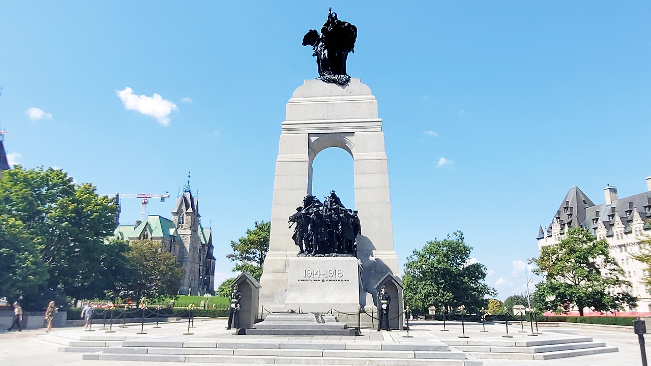 전쟁 기념 탑. 그 앞을 지키는 두명의 군인들