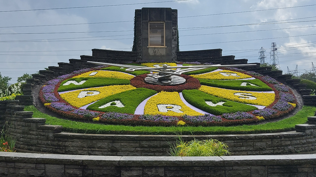 *꽃시계-매년 콘테스트로 디자인을 결정하고 장애인을 상징하는 목발과 지팡이 모양의 바늘들
