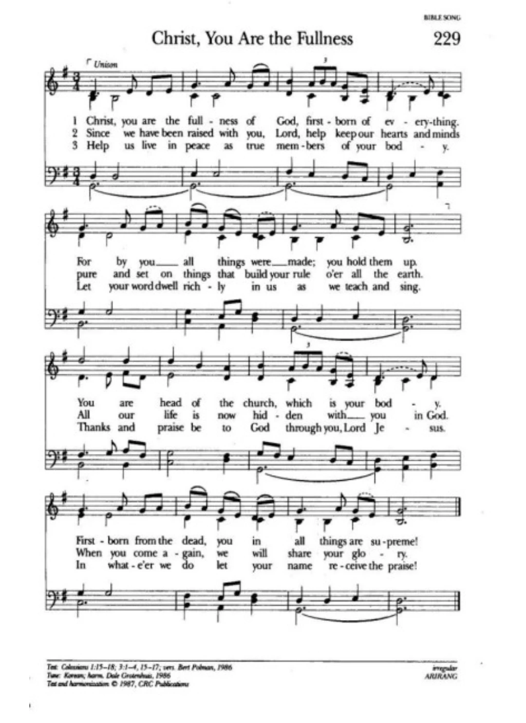 한국인이라면 모두가 알고 있는 "아리랑". 세상은 이 명곡을 알아보고 미국, 캐나다의 찬송가 299장 곡으로 수록하였다니 정말 놀라울 따름이다. 영어 제목은 "Christ, You Are the Fullness"로 가사는 성경의 내용을 사용하고 있으나 멜로디는 우리의 아리랑이다.