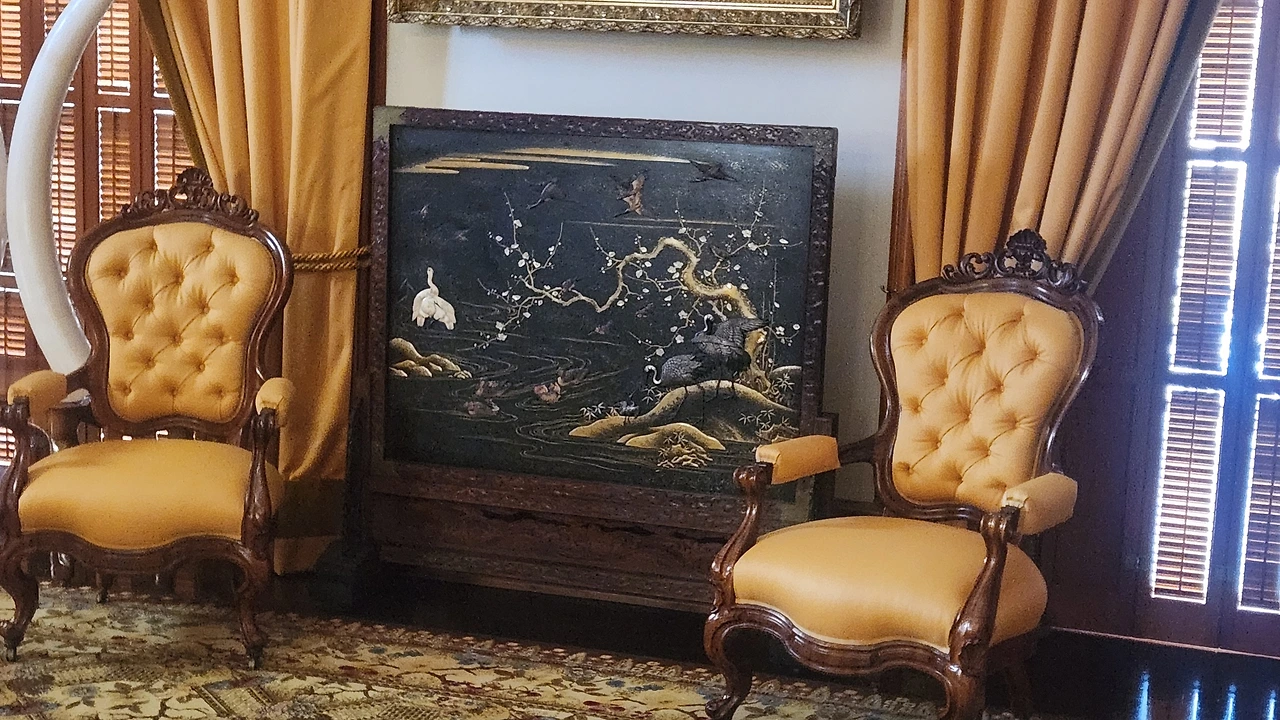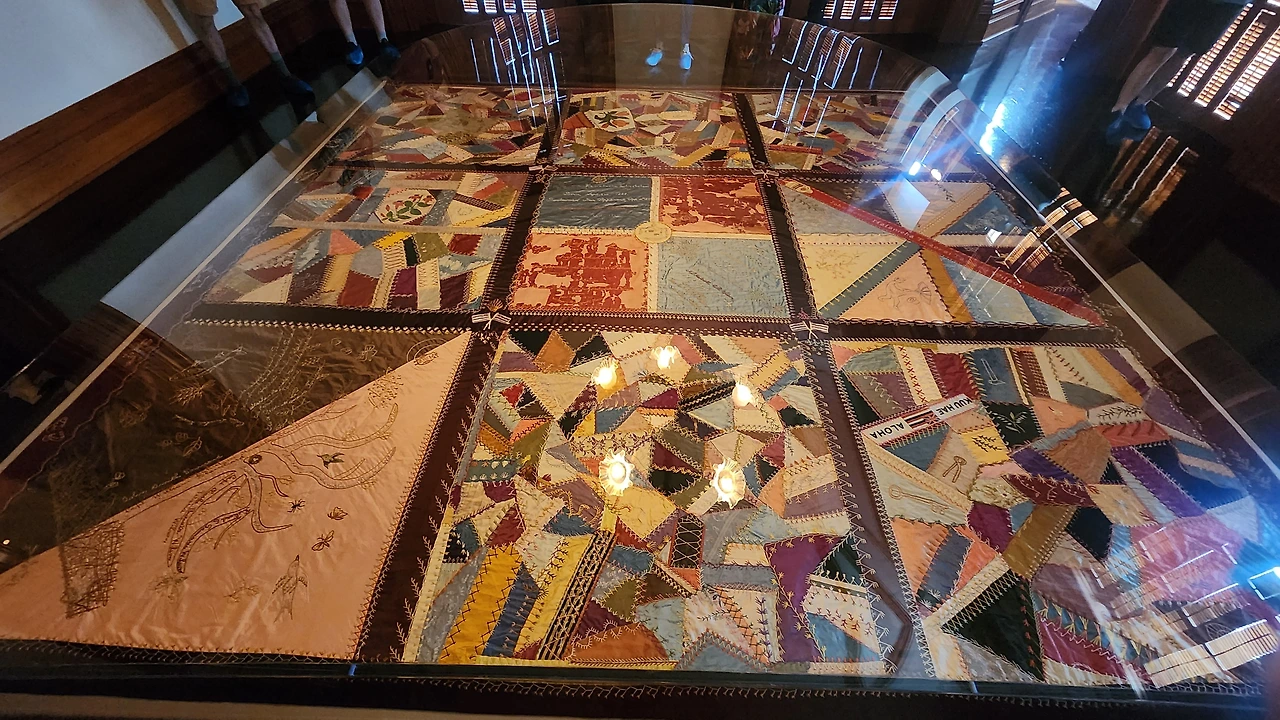 반역시도 혐의로 마지막 여왕이 반태파에 의해 이올라니 궁전에 위폐 되었을 때, 여왕은 방 안에서 음악을 만들고 하와이를 상징하는 문양의 이 커다란 퀼트를 만들며 슬픔을 달랬답니다.