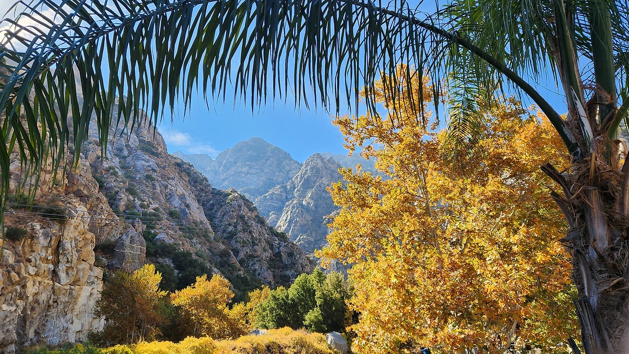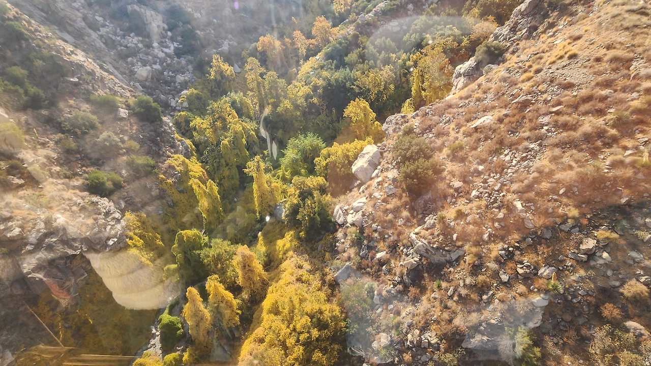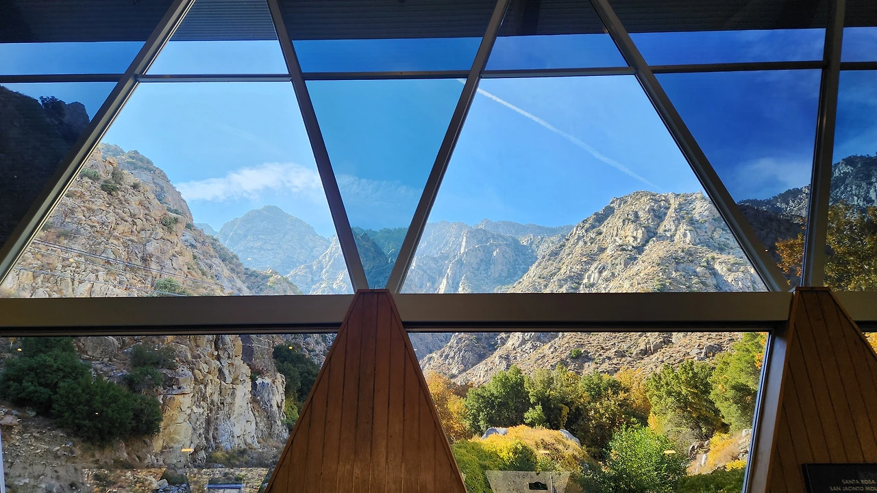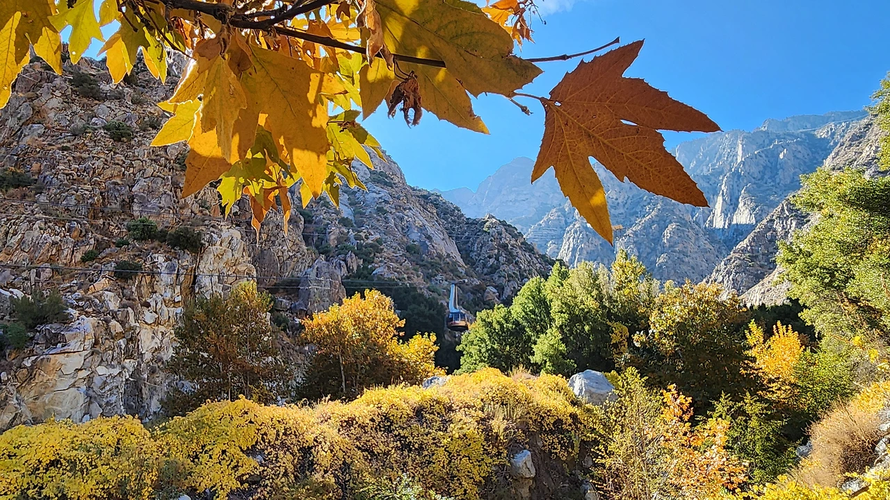 노란 단풍이 아름답게 물든 계곡이 발아래 펼쳐져 있고, 치노계곡의 깎아지른 듯한 절벽, 멀리 보이는 사막에 펼쳐진 풍력 바람개비들, 그리고 구름