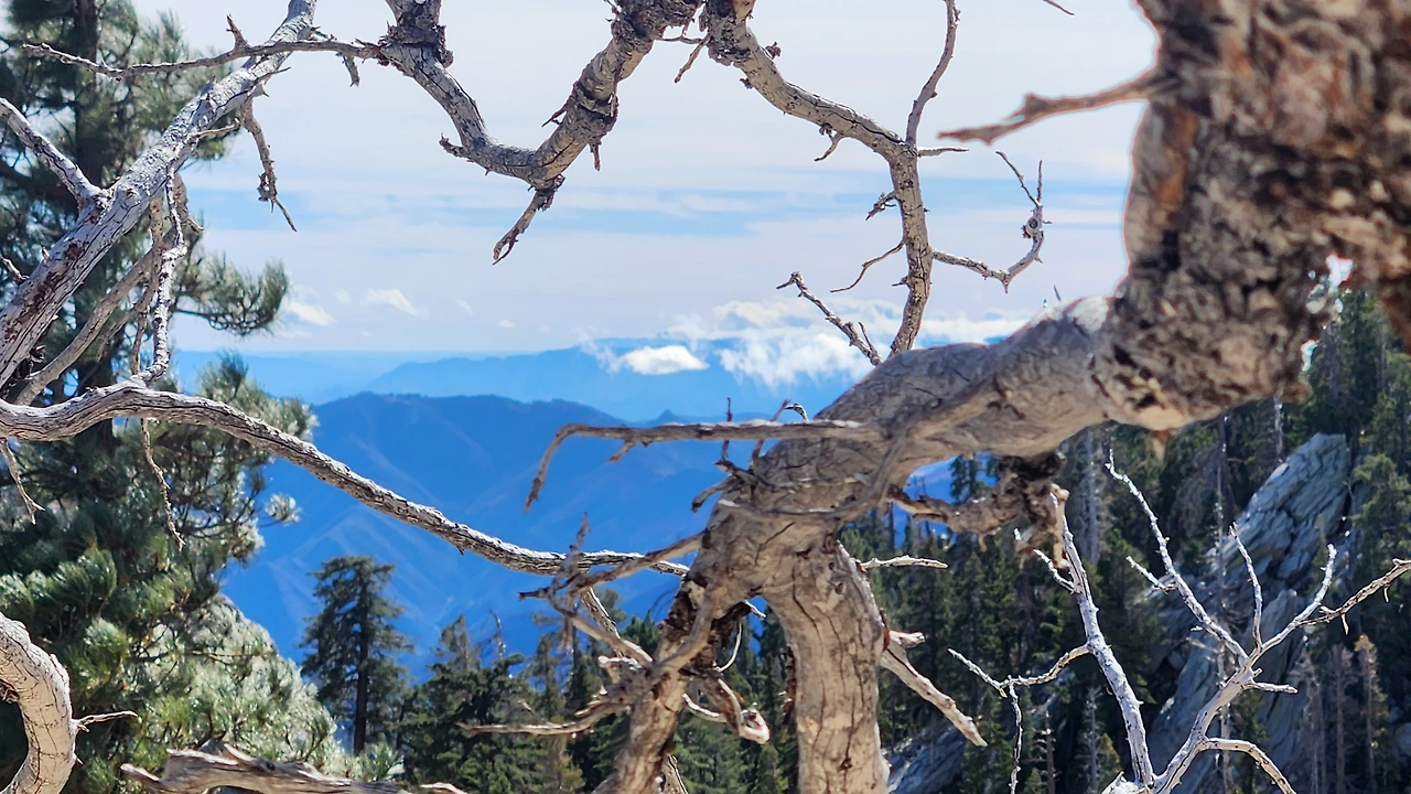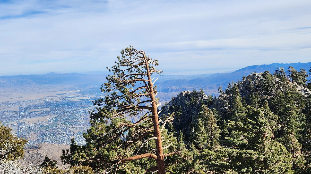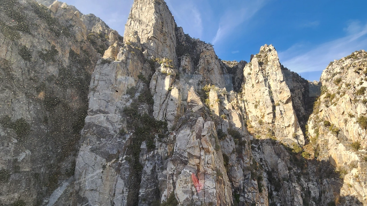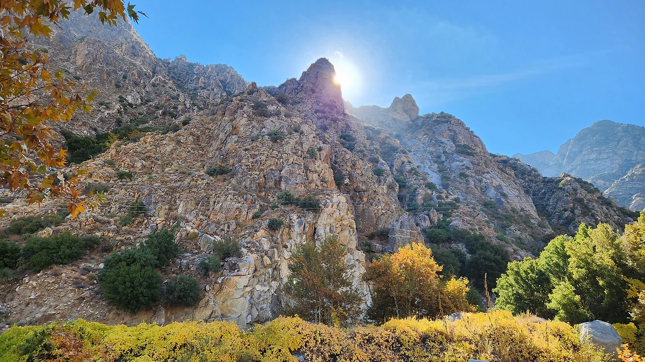 노란 단풍이 아름답게 물든 계곡이 발아래 펼쳐져 있고, 치노계곡의 깎아지른 듯한 절벽, 멀리 보이는 사막에 펼쳐진 풍력 바람개비들, 그리고 구름
