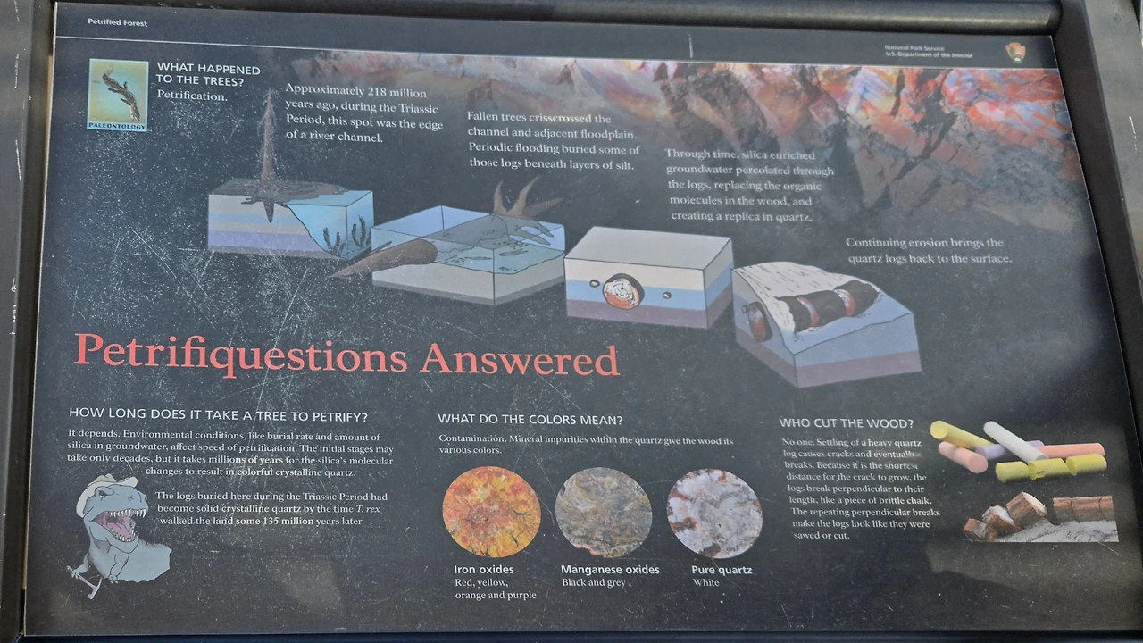 약 6천만 년 전부터 콜로라도 고원이 점진적으로 상승하는 동안, 여전히 묻혀 있던 석화된 나무들은 유리 막대처럼 부러질 정도로 많은 스트레스를 받았습니다.