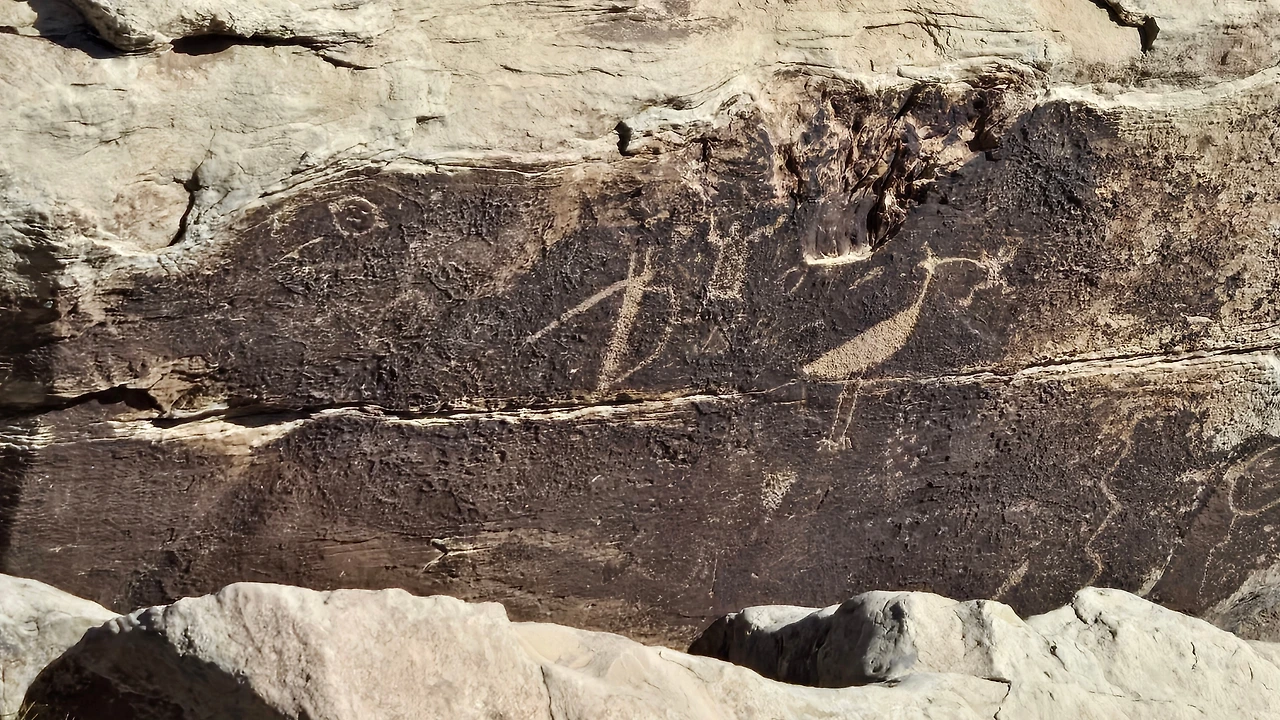 바위의 검은 부분에 새겨진 그림들이 보입니다.