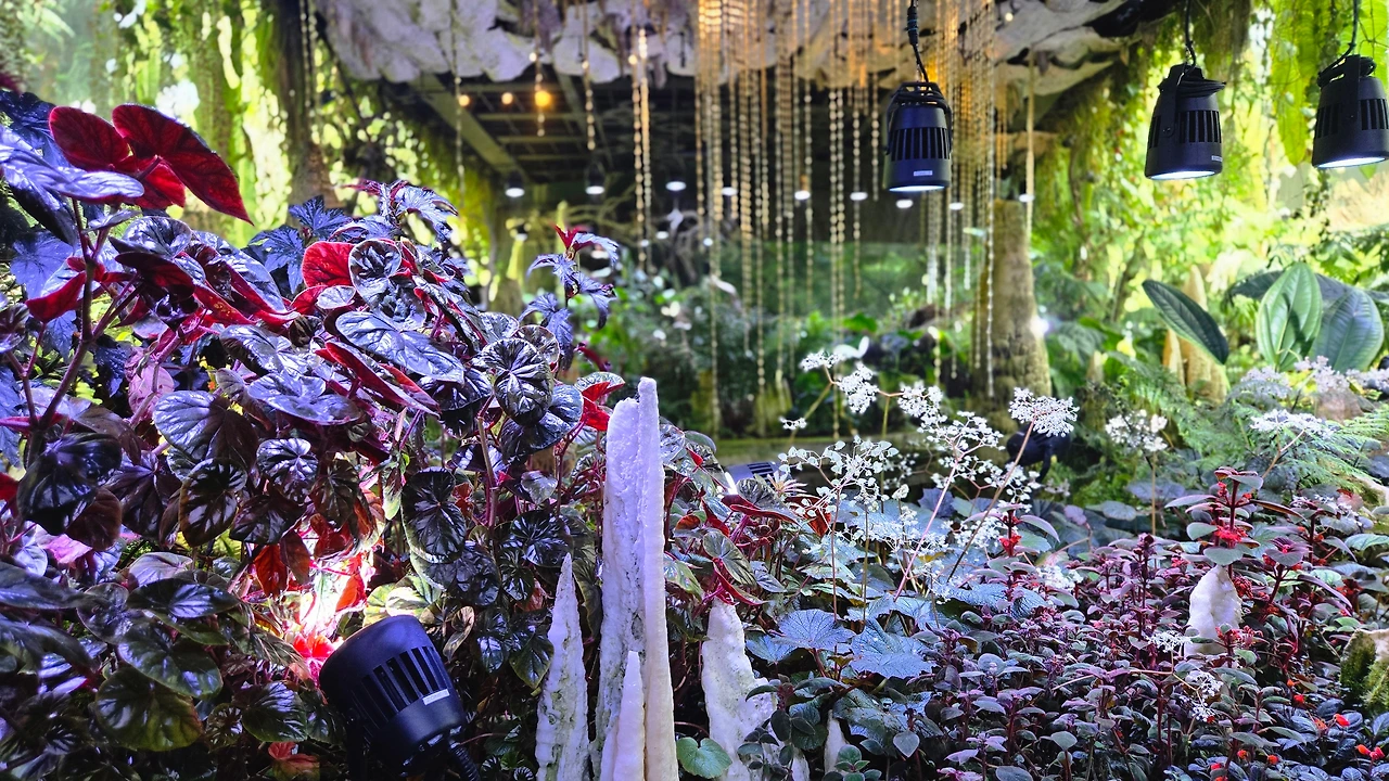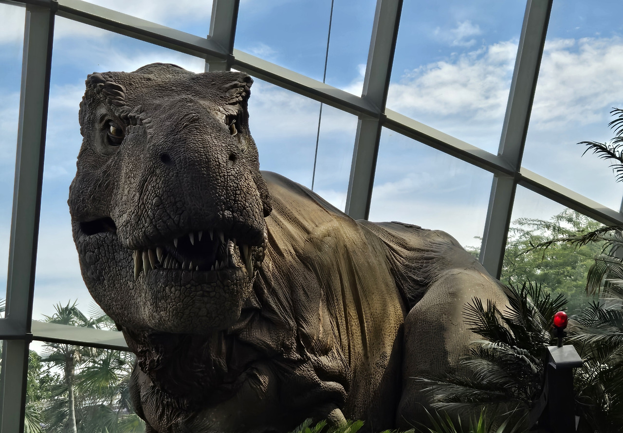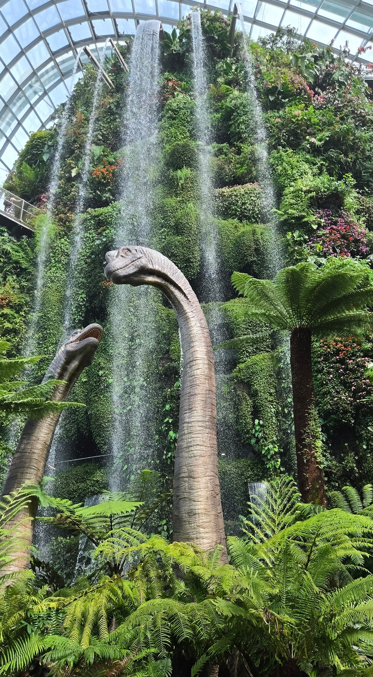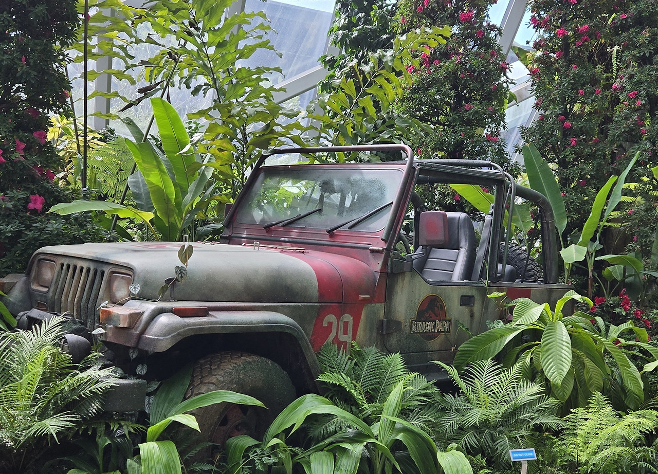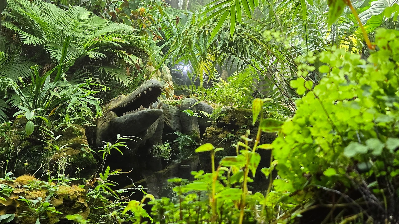맞은편 온실 크라우드 포레스트는 주라기 공원 테마입니다.
