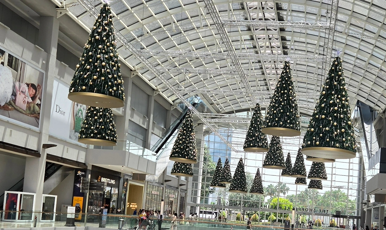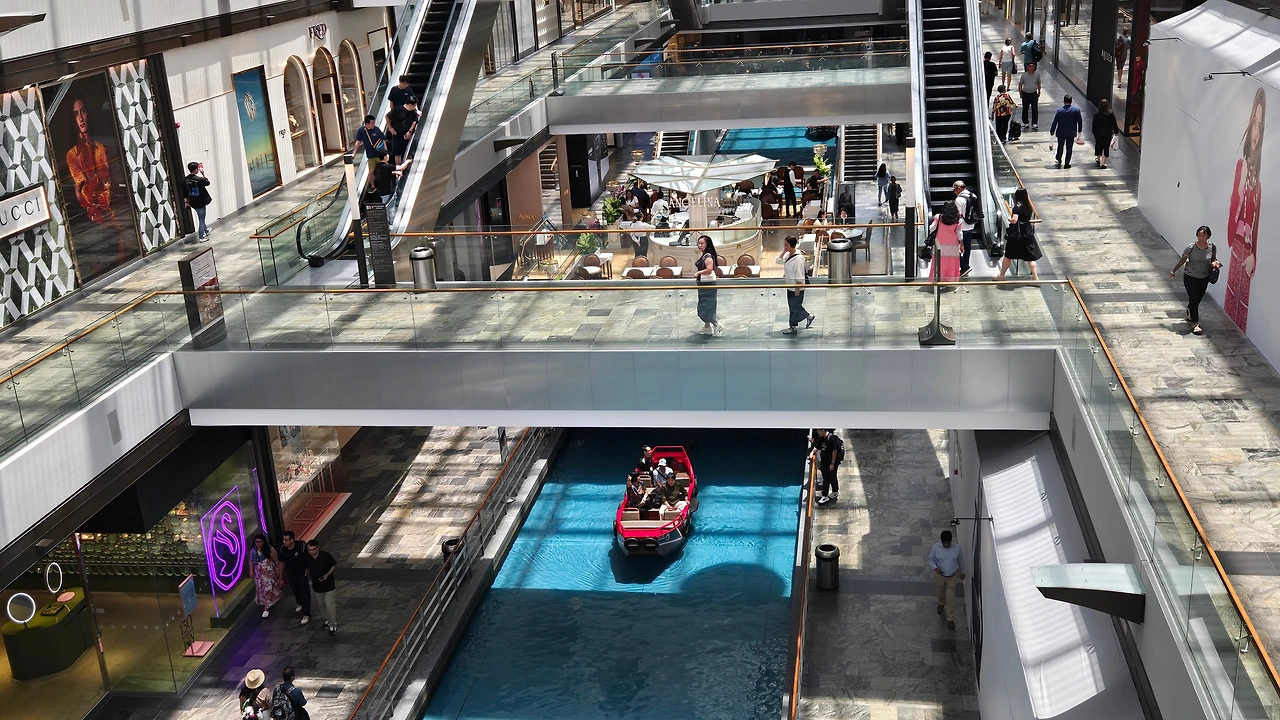 이미 크리스마스 장식이 가득하고 쇼핑몰 한가운데를 가로지르는 보트가 보입니다.
