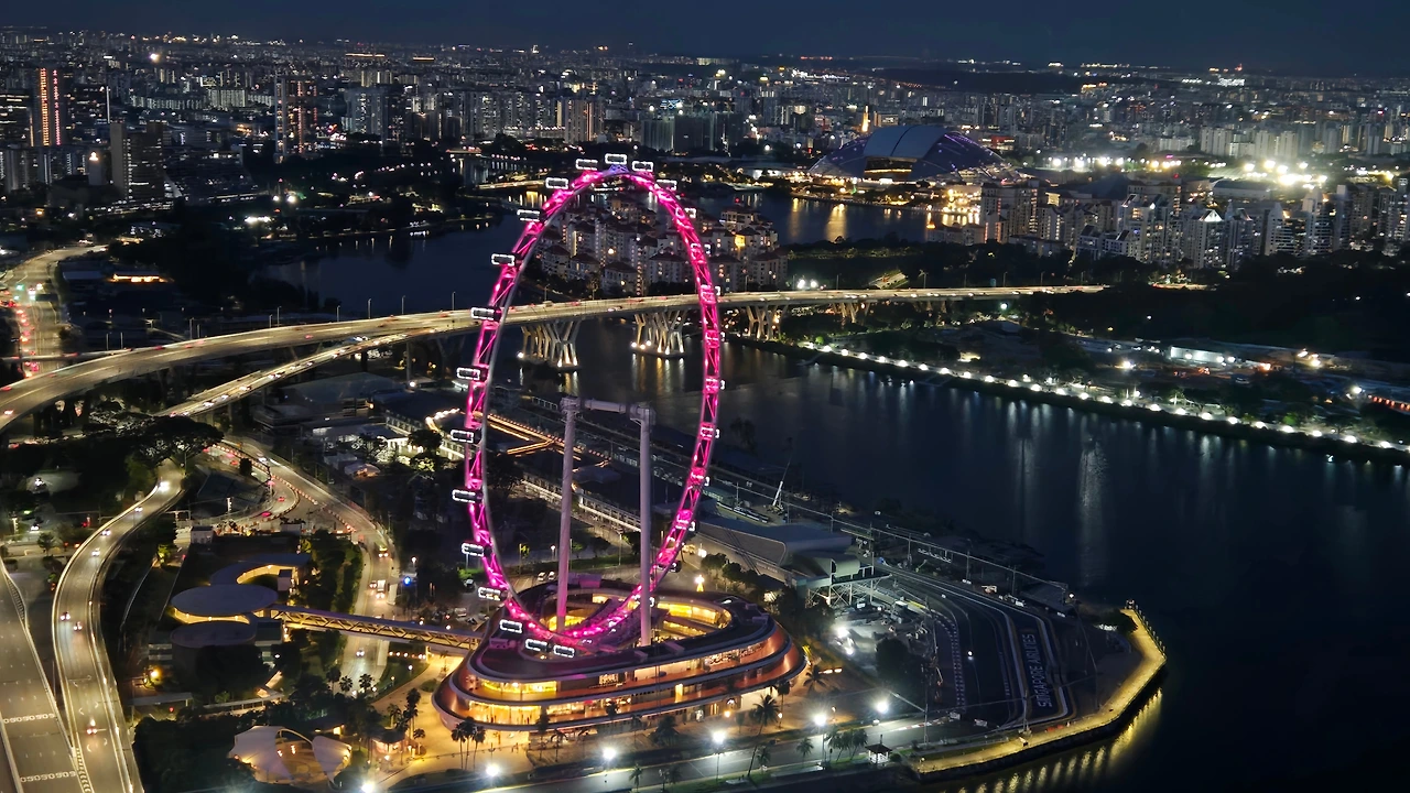특히 싱가폴 플라이어 관람차 아래에 위치한 싱가폴 F1 그랑프리 마리나 베이 서킷이 더욱 선명하게 보입니다.