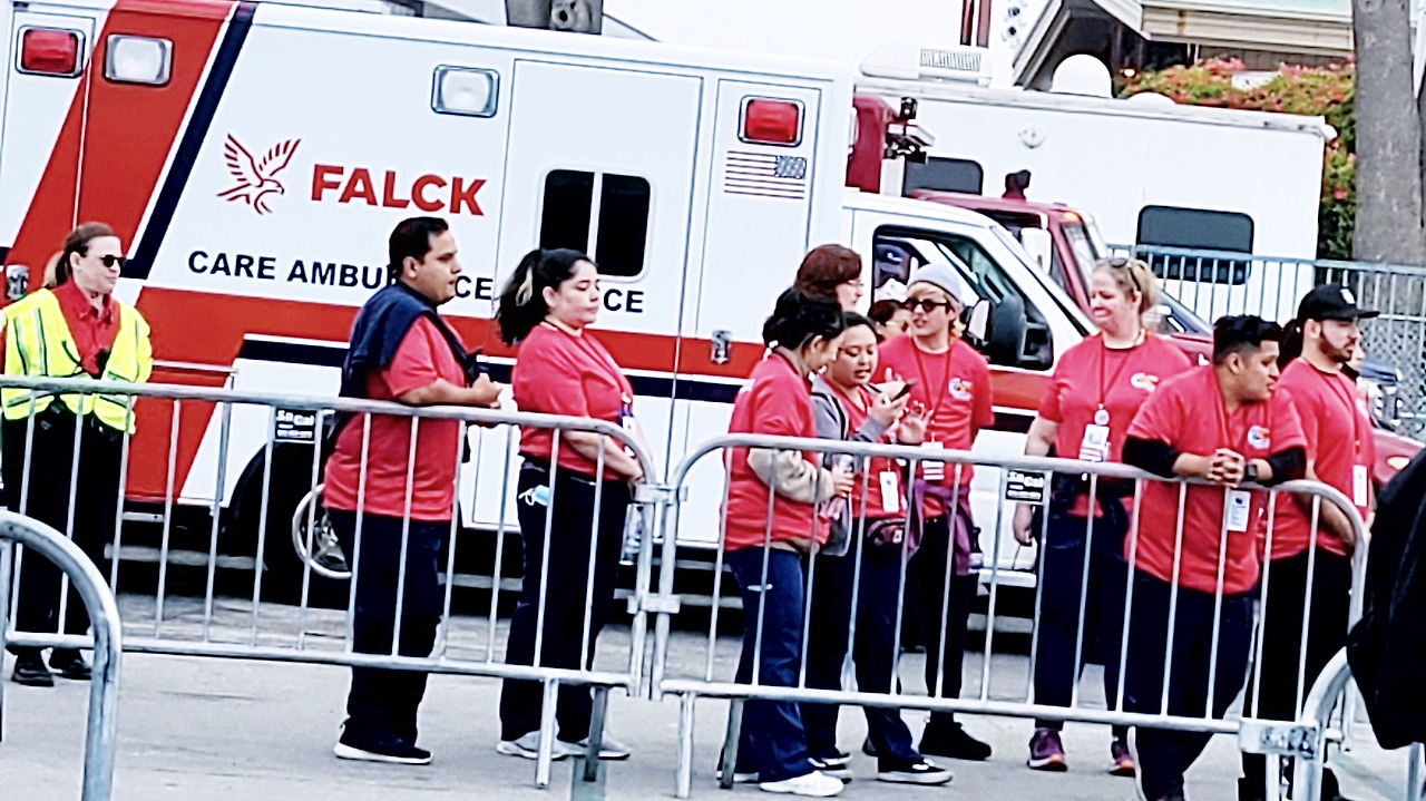 의료 자원봉사 참가자들은 결승선에서 대기 중